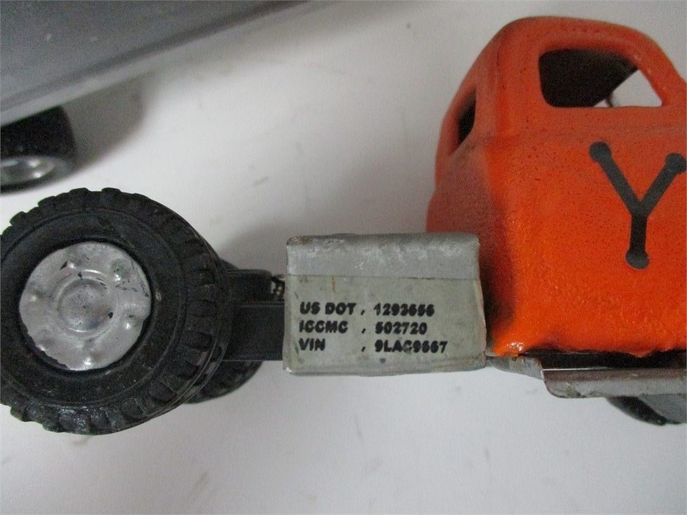 Pressed steel semi-truck with detachable double trailer set. Cab painted orange with silver grille and trim, trailers finished in silver with hand-painted orange-and-black “YELLOW” logos on sides and rear. Tractor marked with applied detail plates including mock DOT/ICC/VIN numbers. Tandem axles with rubber tires throughout.