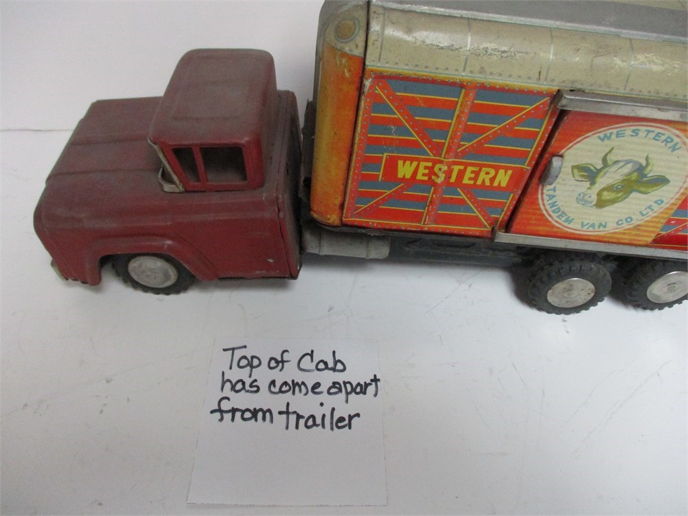 Condition: Heavy play wear and surface rusting to cab and undercarriage. Top of cab is loose and box has separated from frame but remains with the piece. Trailer graphics show fading and losses but retain good color visibility. Wheels present, axles worn from age. Displays with strong vintage Western theme despite wear.