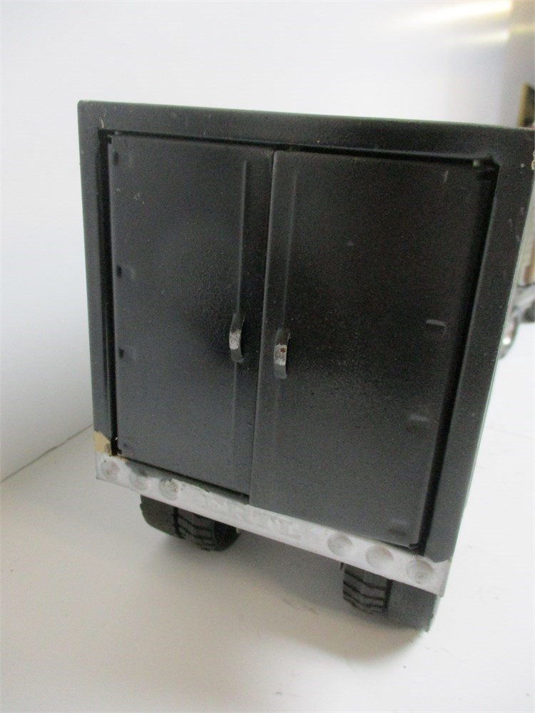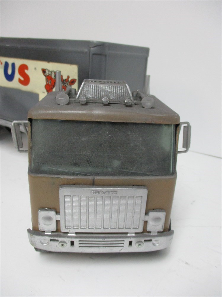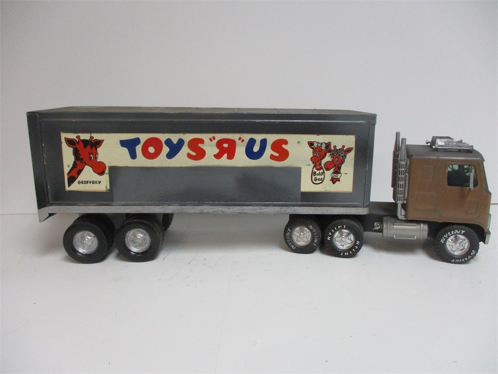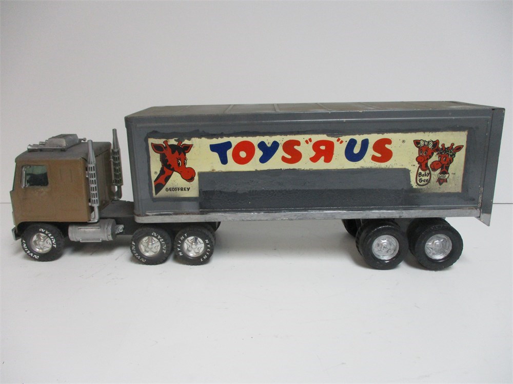 Pressed steel and plastic semi-truck with detachable van trailer. Cab finished in brown and silver with detailed grille and exhaust stack. Trailer sides decorated with large Toys‘R’Us logos and Geoffrey the Giraffe graphics. Rear doors open, tandem axles with rubber tires.