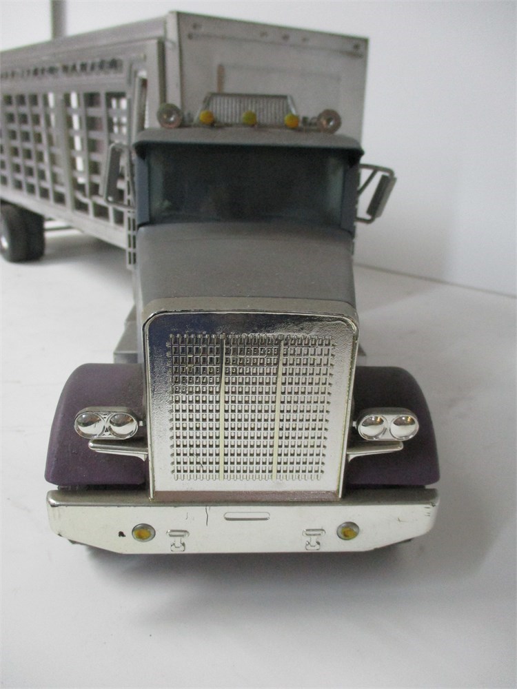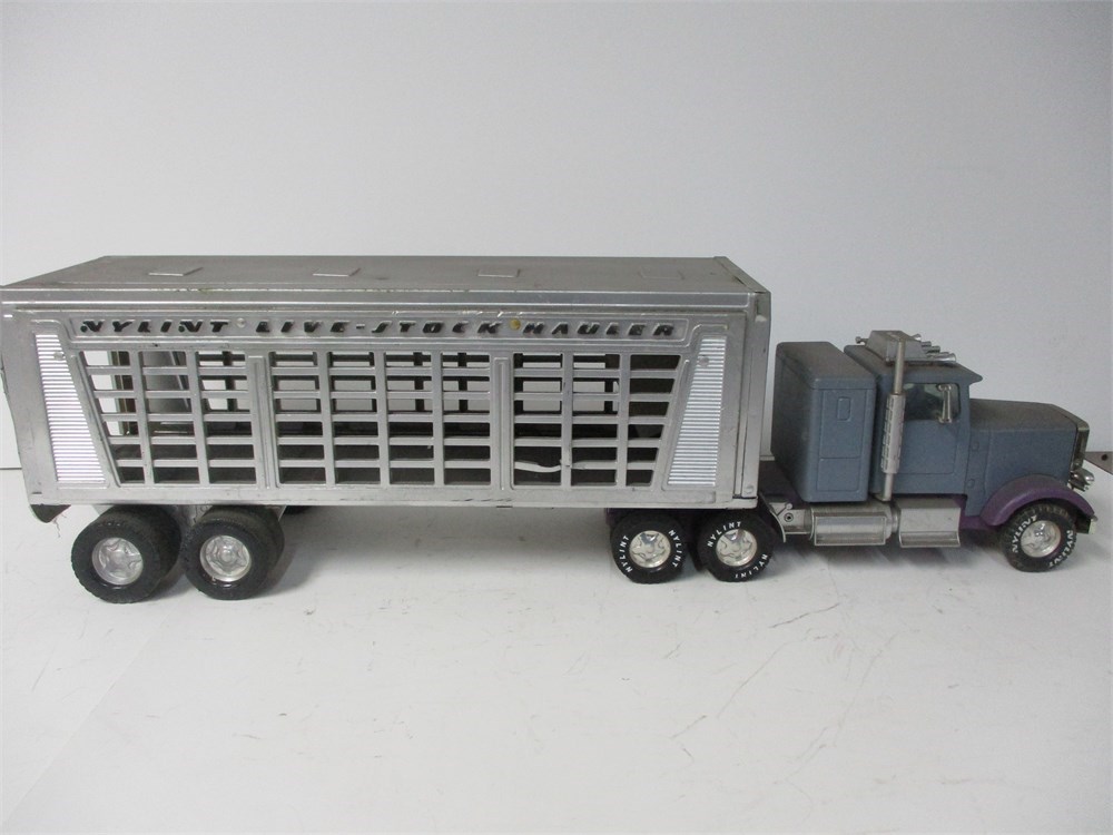 Up for auction is a vintage Nylint Livestock Hauler semi truck, featuring a gray trailer with “Nylint Livestock Hauler” side panels and a rare purple cab.