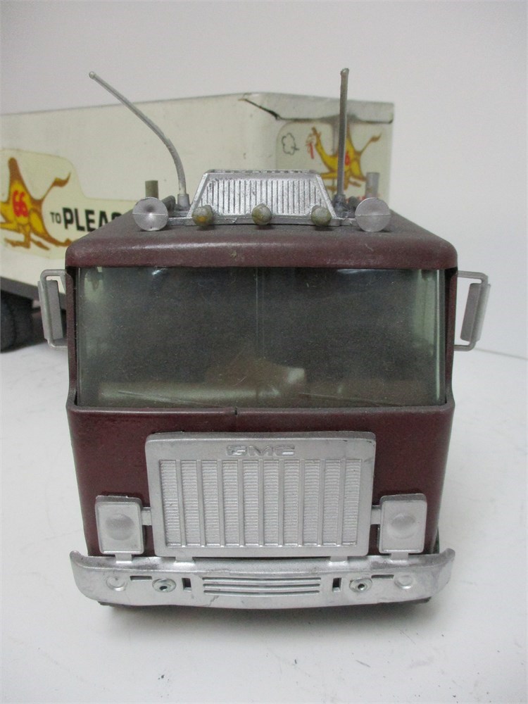 • Features: Metal body with plastic parts, rolling wheels, opening rear trailer doors.
