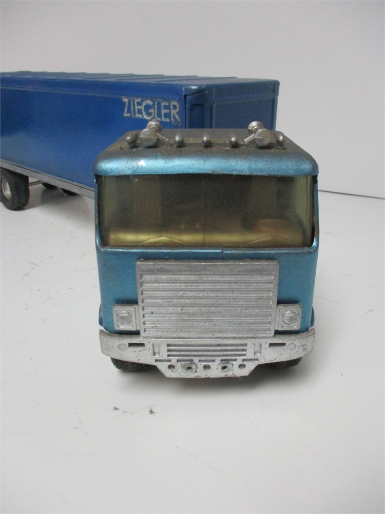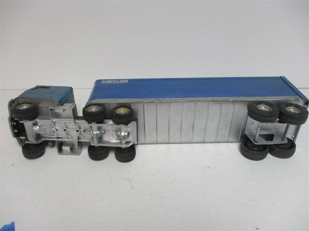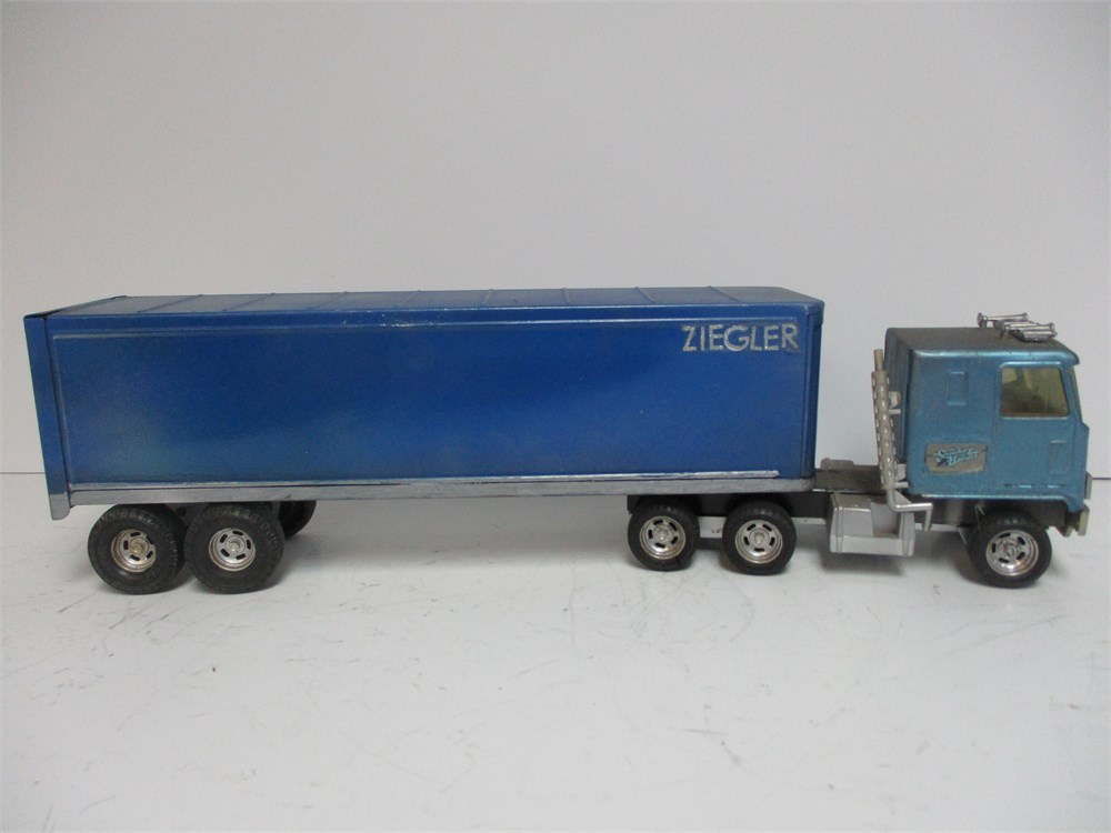 Offered here is a vintage Nylint pressed steel semi truck and trailer advertising Ziegler, featuring a blue cabover tractor with matching silver and blue trailer.