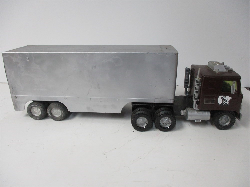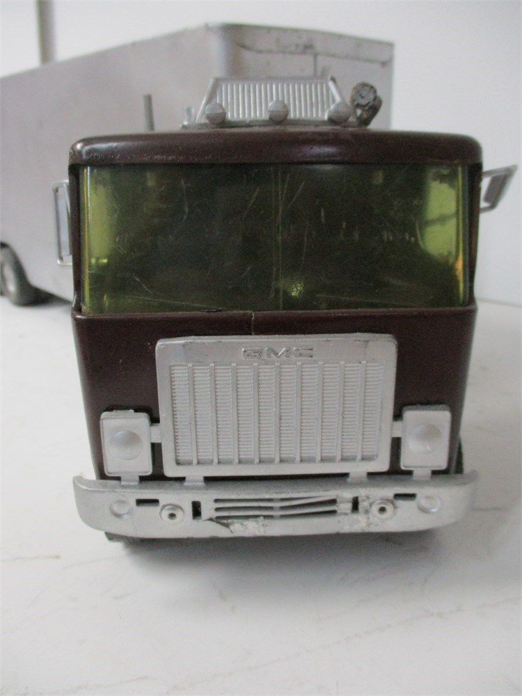 Up for auction is a vintage Nylint GMC cab-over semi truck with silver box trailer. This classic pressed-steel toy truck was produced by Nylint during the 1970s–80s and features the distinctive GMC cab with tinted windshield and matching unmarked silver trailer.