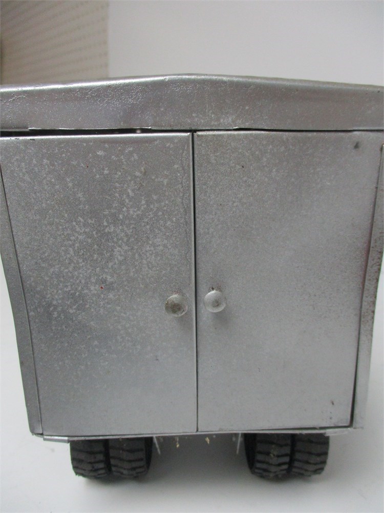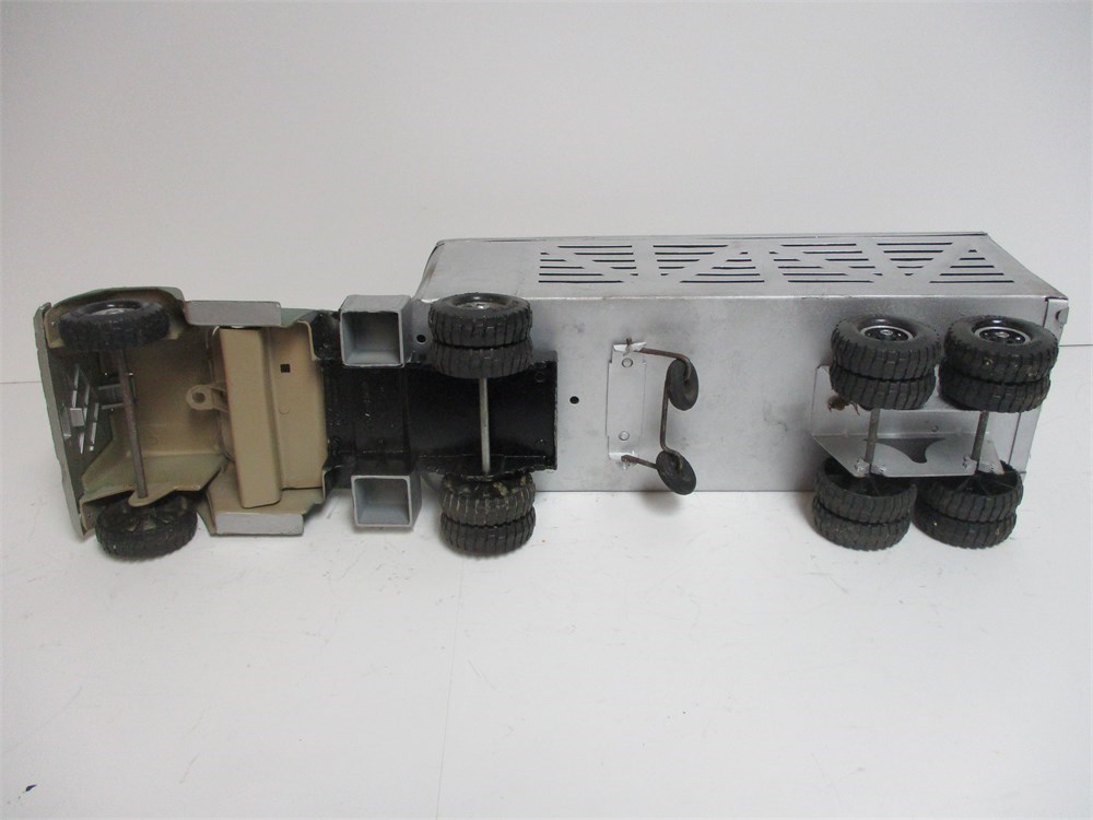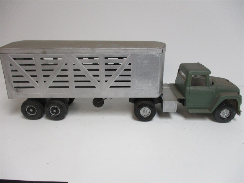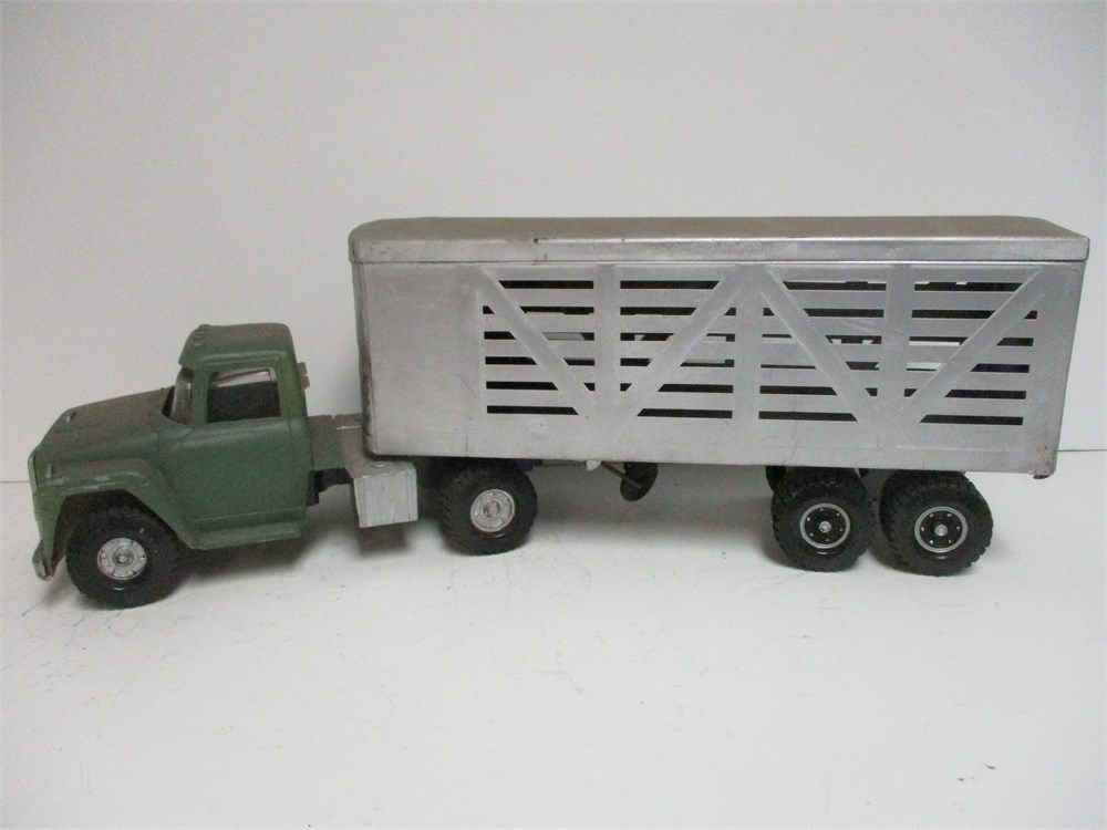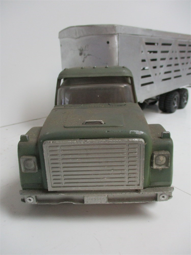 Up for auction is a vintage Nylint pressed steel livestock hauler featuring a green cab and silver vented trailer. The cab is styled with an International-style grille, and the trailer includes rear opening doors.