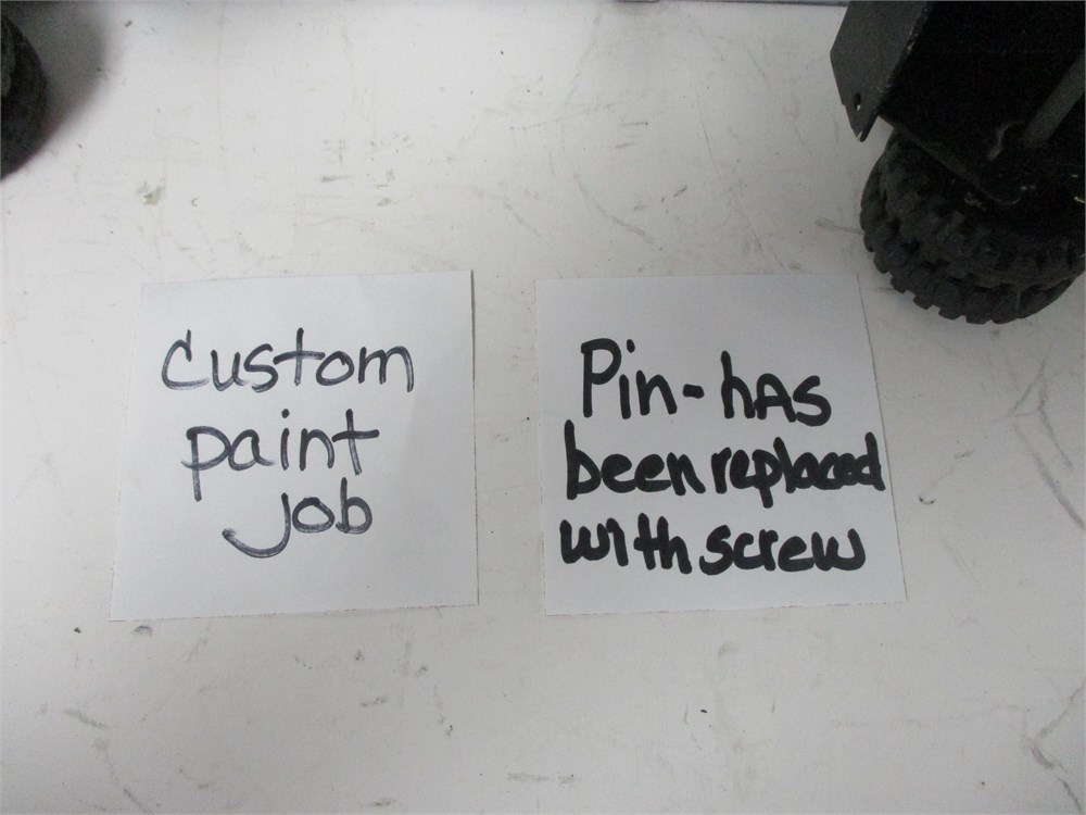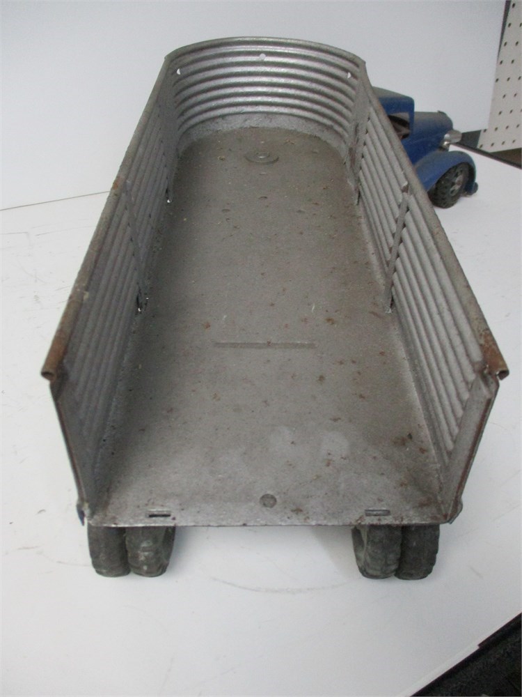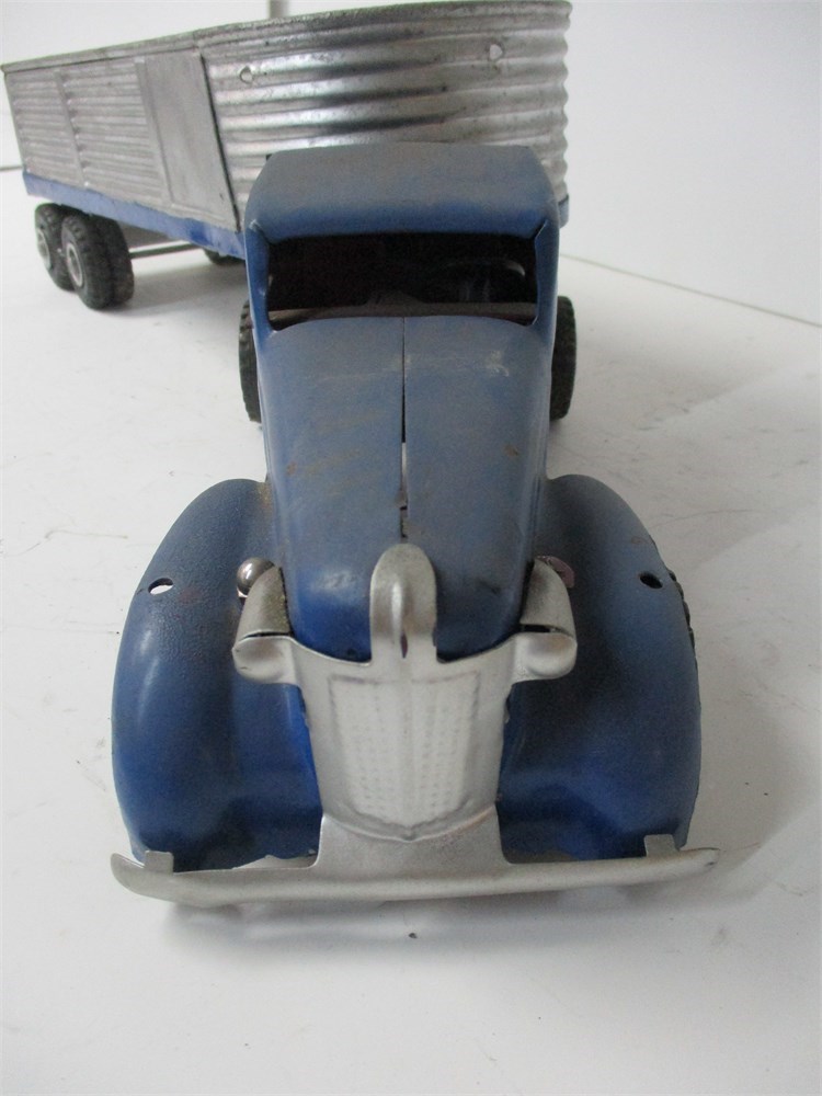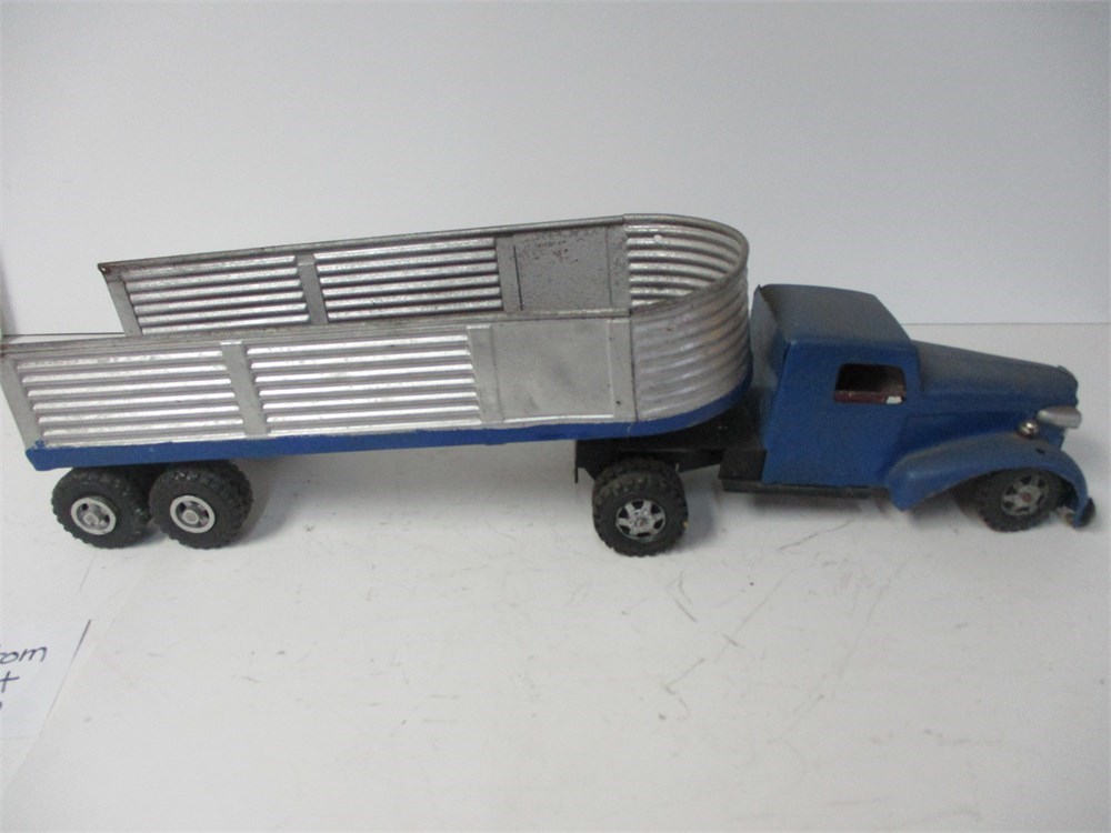Offered here is a vintage pressed steel semi tractor and livestock trailer. The cab is finished in a later blue custom paint job, paired with a silver livestock trailer featuring rounded corrugated sides. A non-original repair has been made to the kingpin hitch — the pin has been replaced with a screw to hold the trailer correctly. Truck shows play wear, paint loss, and scratches consistent with age. Displays well despite condition issues, and has a great old-time farm hauler look.
