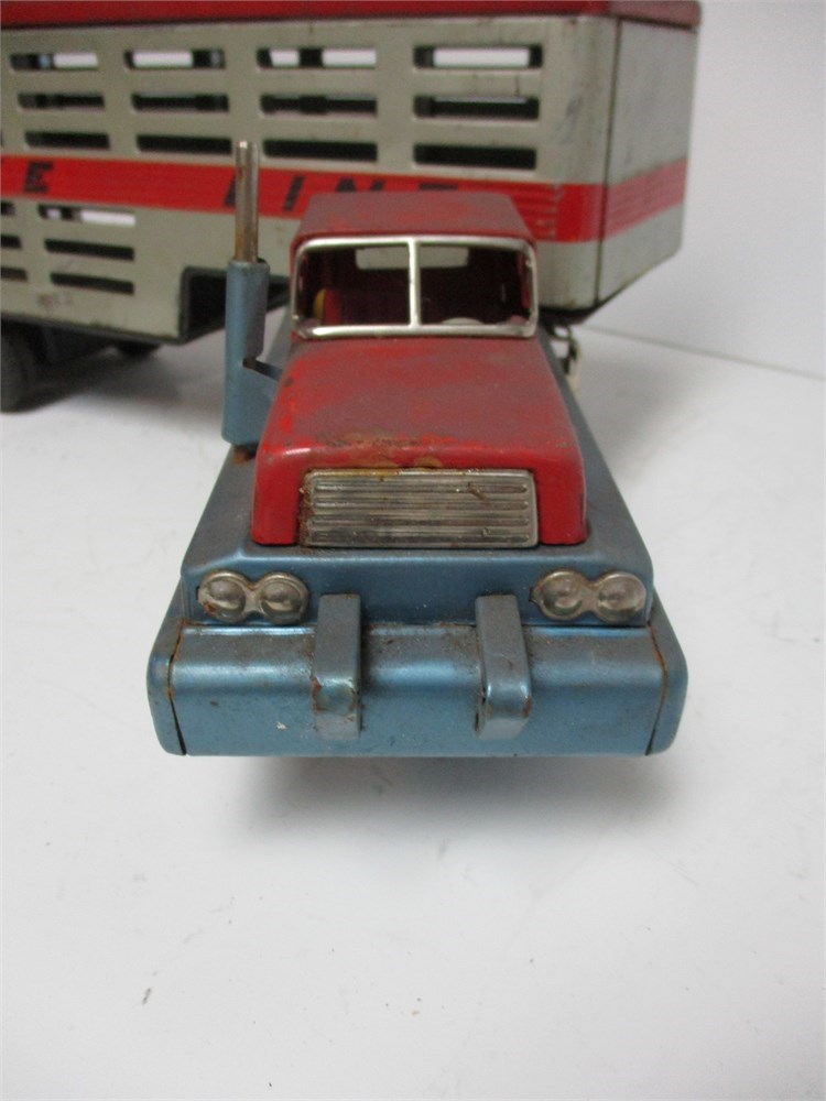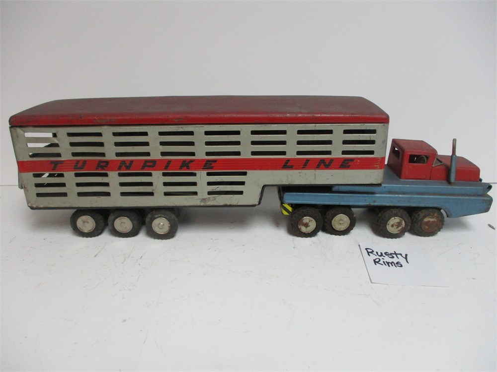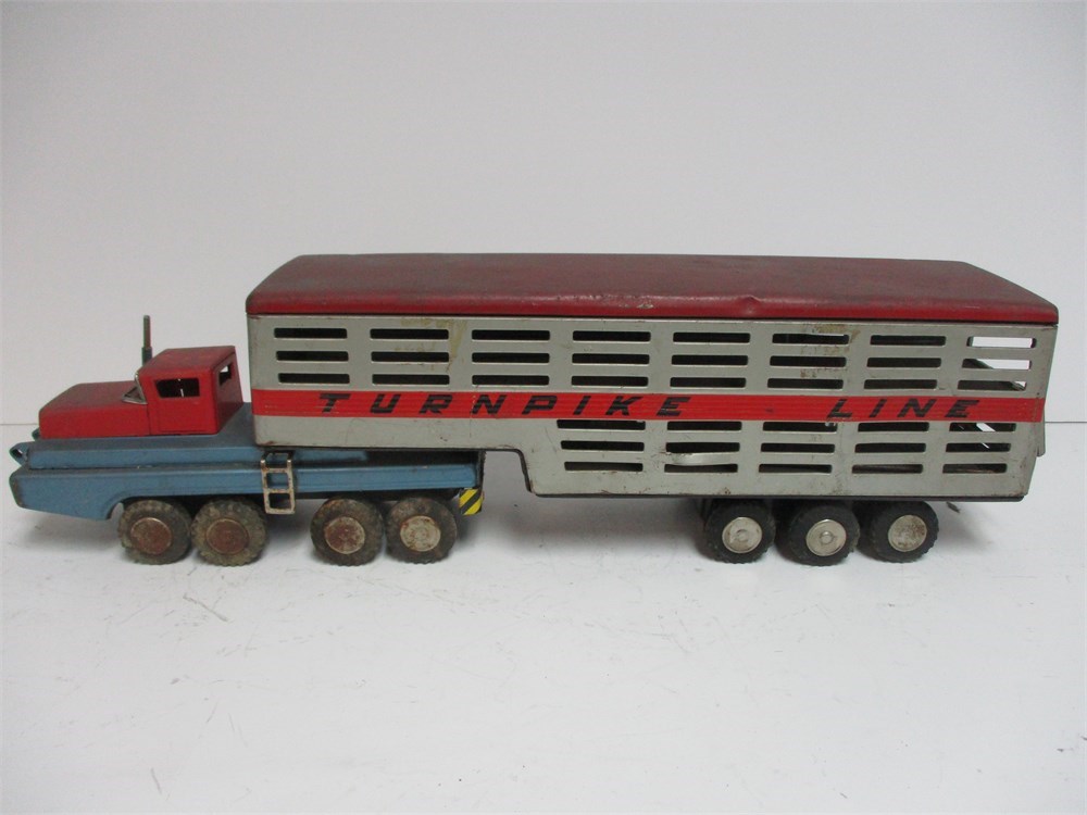 Up for auction is a vintage pressed steel SSS International Turnpike Line livestock hauler semi-truck and trailer. This classic toy features a red cab with blue chassis and a silver trailer with “Turnpike Line” graphics and ventilation slats along the sides. The rear includes a functioning livestock gate-style door.  I believe it is a double deck hog trailer.