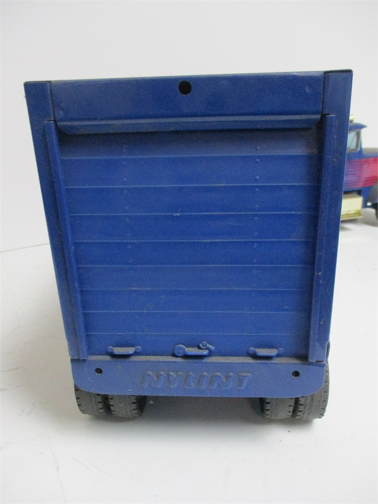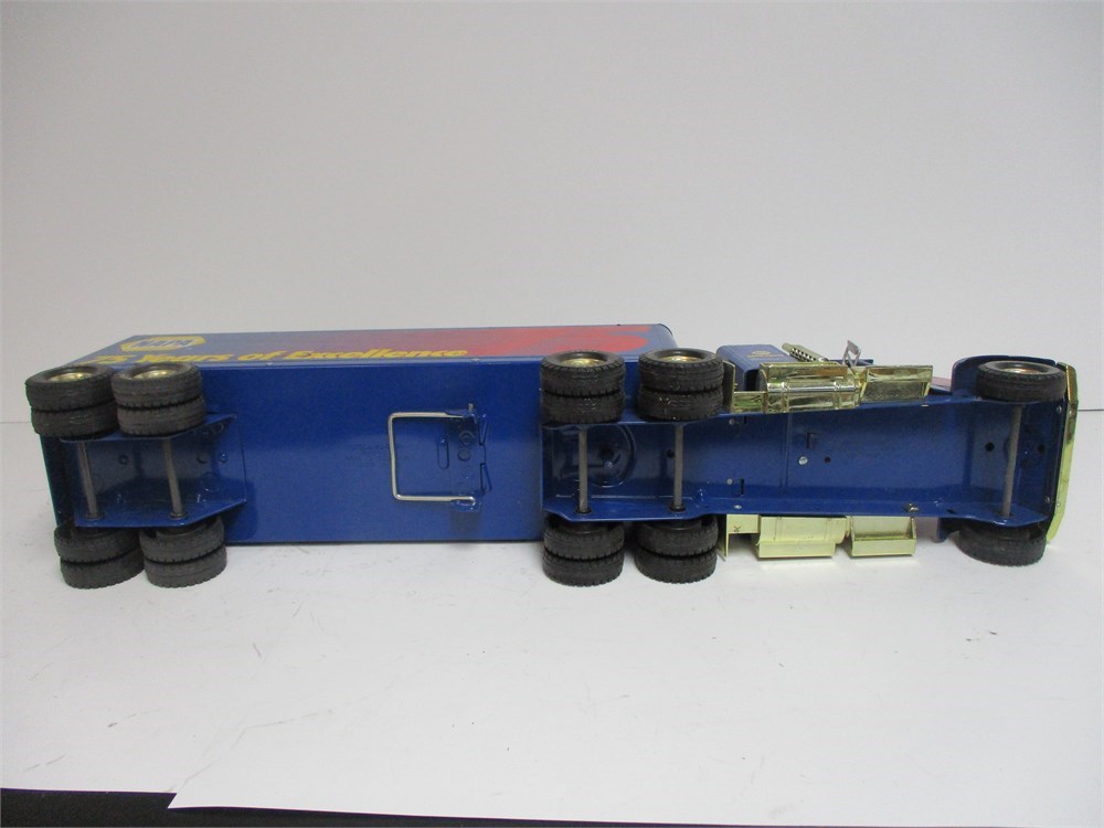 Materials: pressed steel trailer & cab with plastic/gold-tone trim, vinyl tires