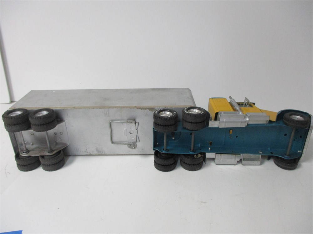 Condition: Shows playwear and restoration. Tractor and trailer have custom repaint (yellow/teal cab; plain silver van). Scuffs, scratches, edge wear and light oxidation/spotting on trailer; small dings from use. Roll-up door present; typical stiffness from age. Tires roll; overall solid display piece.