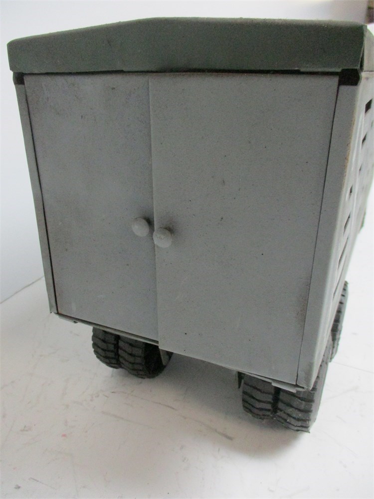 • Condition: playwear throughout; scattered rust/oxidation (see photos), cloudy windshield, scuffed decals/paint, general dust from storage. Rolls freely; doors open/close.