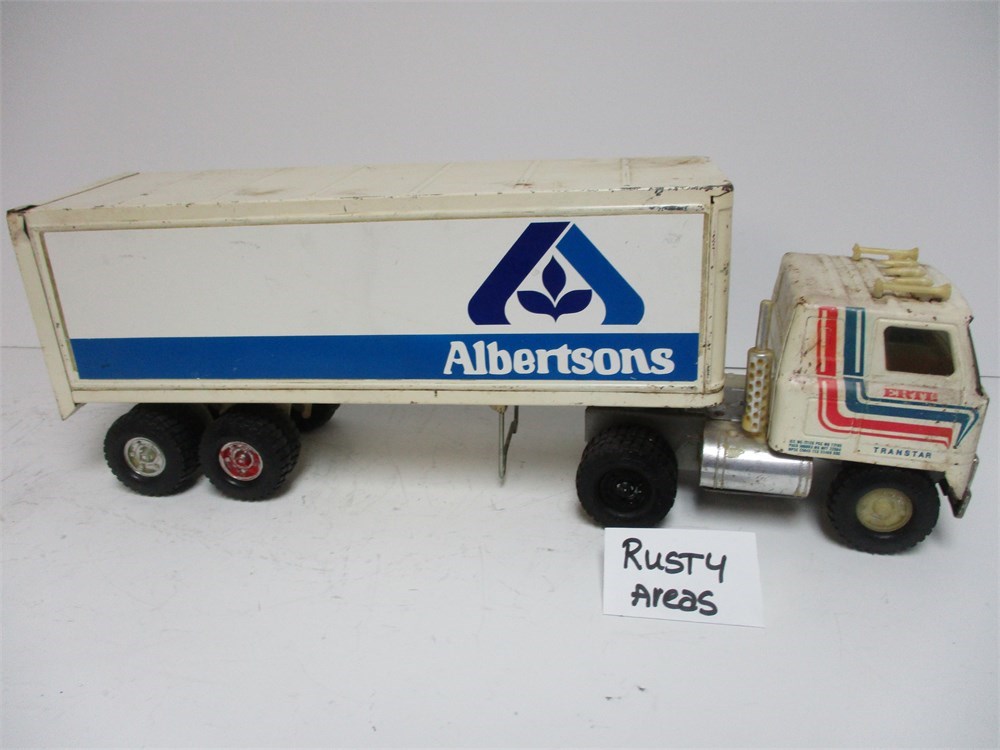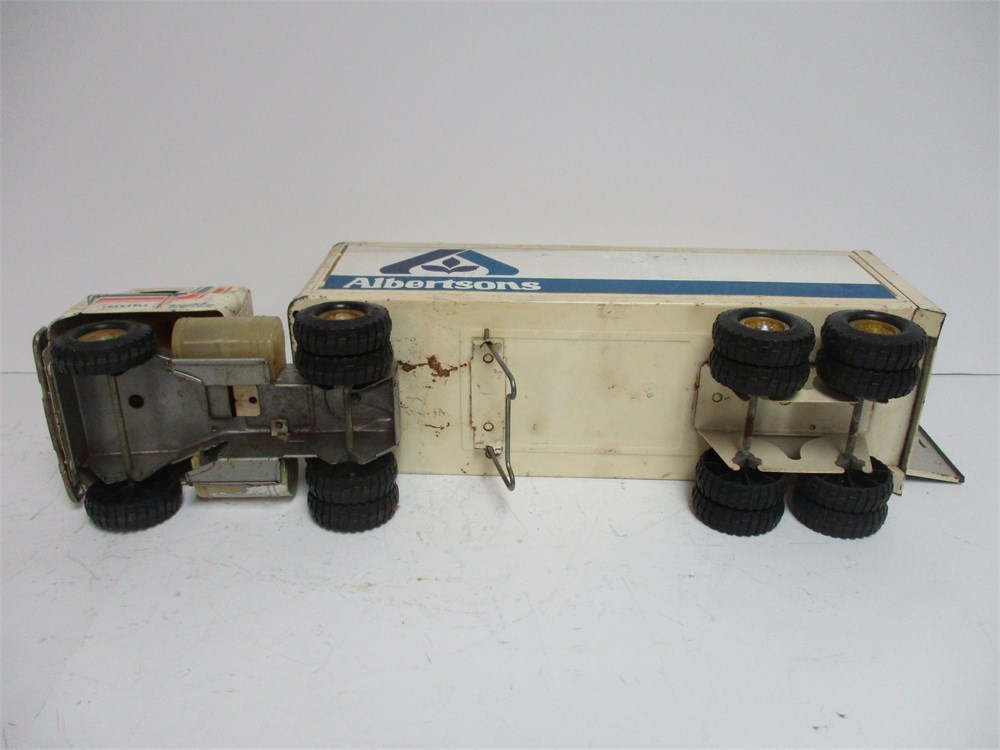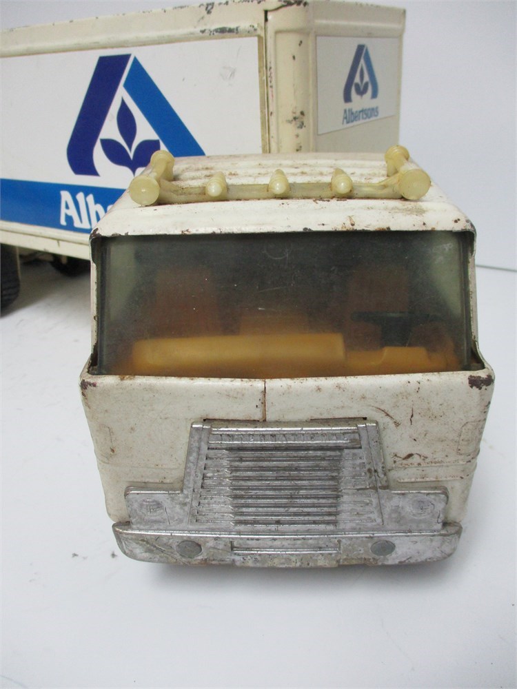 Pressed-steel Nylint semi truck with GMC cabover tractor and detachable van trailer in Albertsons livery, c. 1970s. Opening rear swing doors, dual rear axles, plastic grille/stack details, and rolling rubber tires.