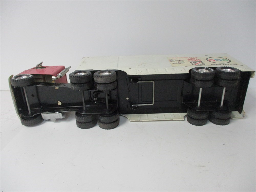 • Condition: trailer missing entire roof panel; cab has a custom repaint; decals present with wear; scratches, dings, and light surface rust from play; rolls as shown.