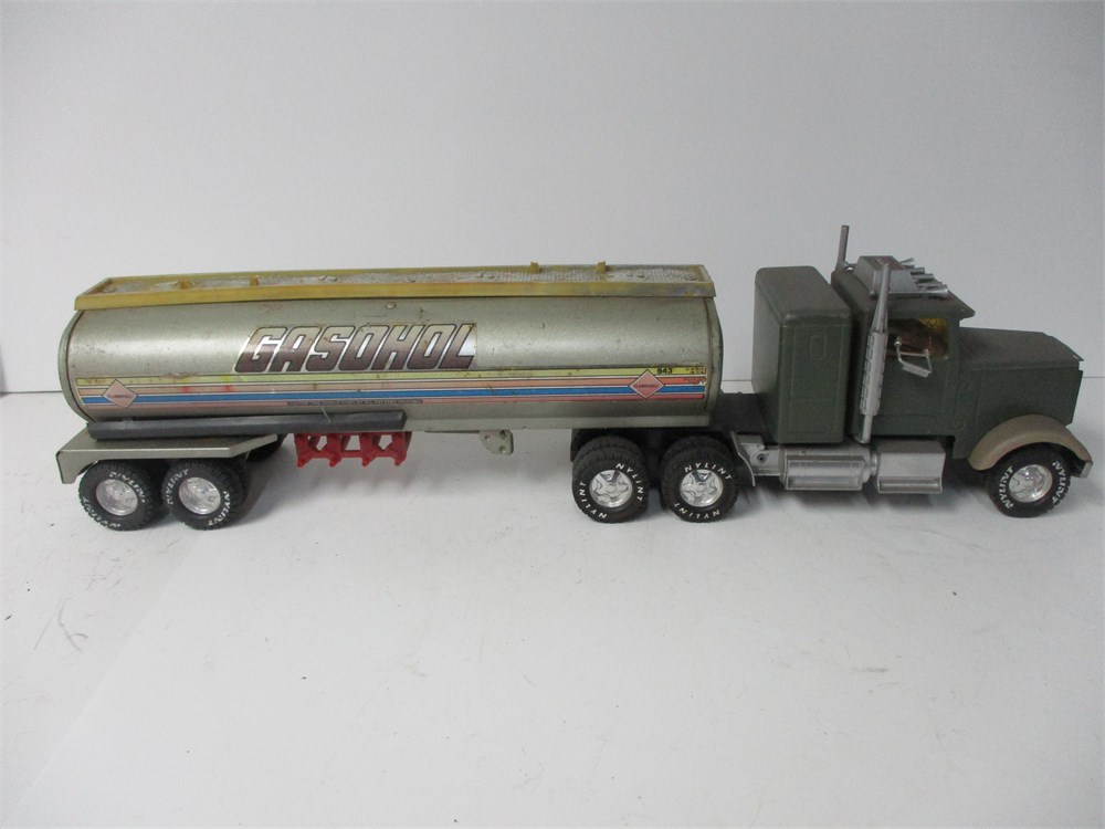 Pressed-steel Nylint big-rig with gray/olive Peterbilt-style tractor and silver tanker trailer wearing bold GASOHOL graphics. Features, dual stacks, yellow top catwalk/manway, and rubber tires on chrome wheels. Approx. 27" overall length.  Missing grill.