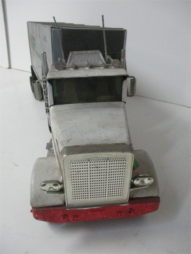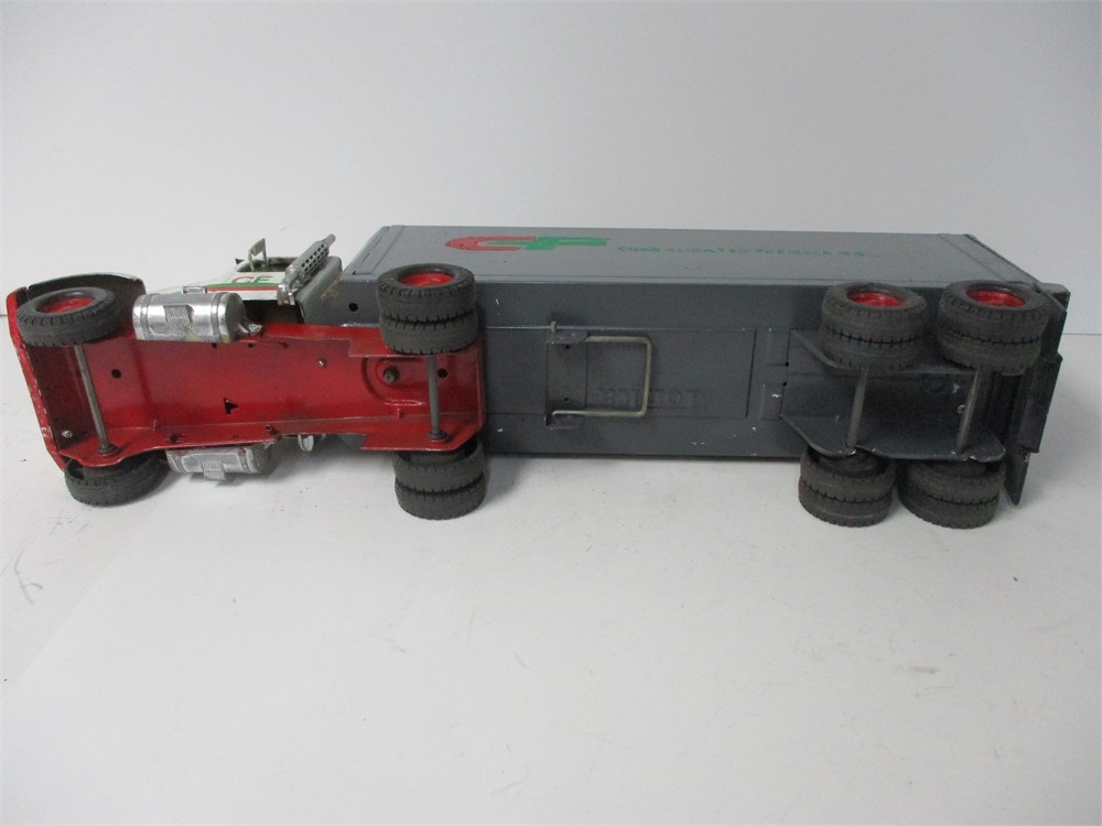 Pressed-steel Nylint tractor with steel box van in home-done Consolidated Freightways (CF) livery; opening rear door; rolls freely.