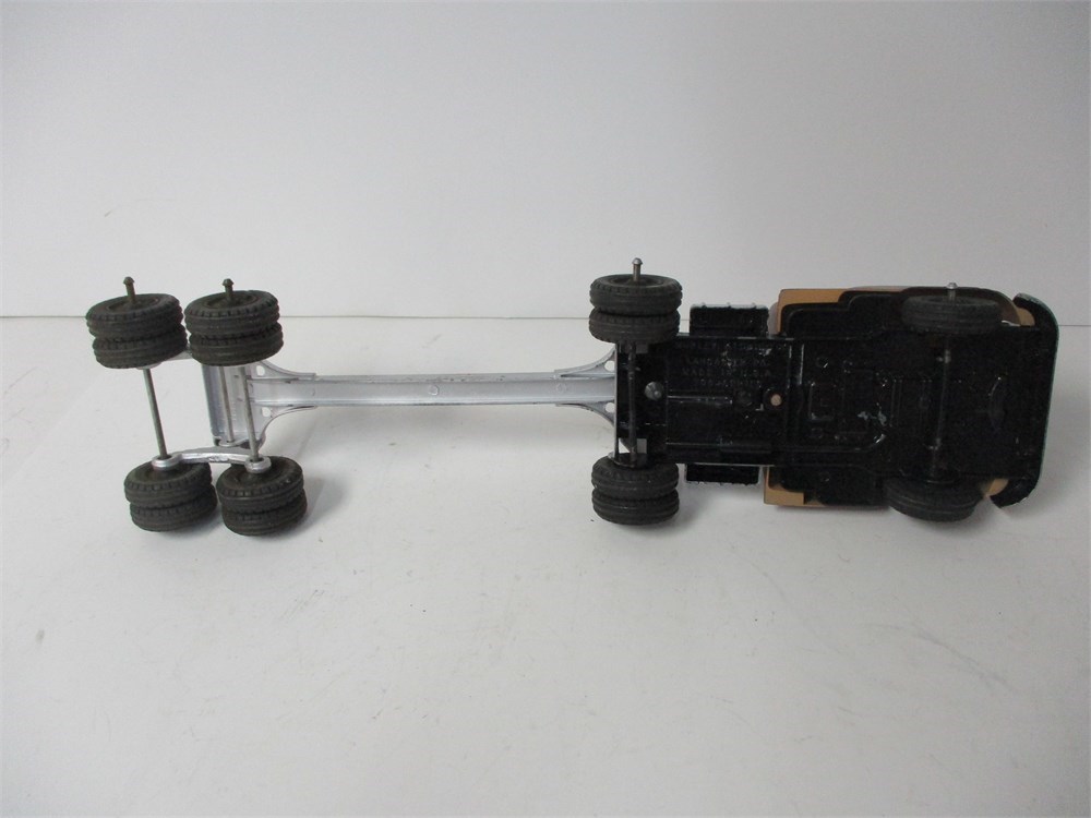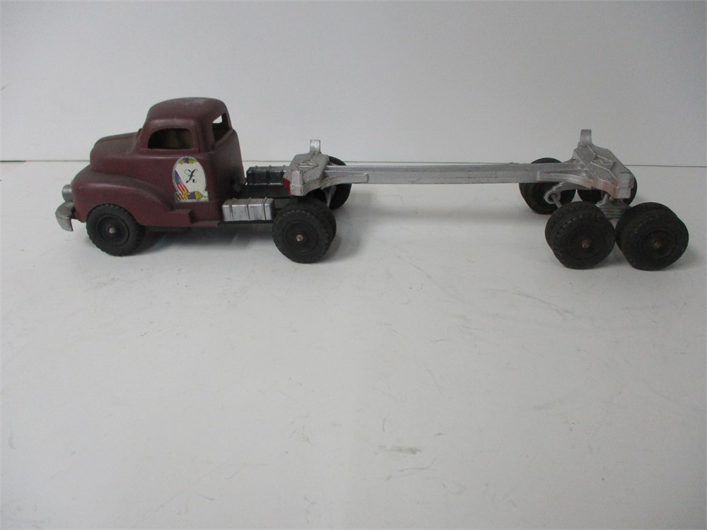 Pressed-steel cabover tractor with a long pole/log trailer. Trailer looks shop-made from cast/aluminum channel and couples to the fifth wheel; tandem rear axles on the trailer, single on the tractor. Rolling freely.
