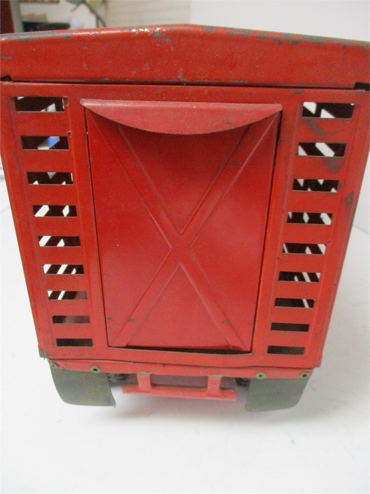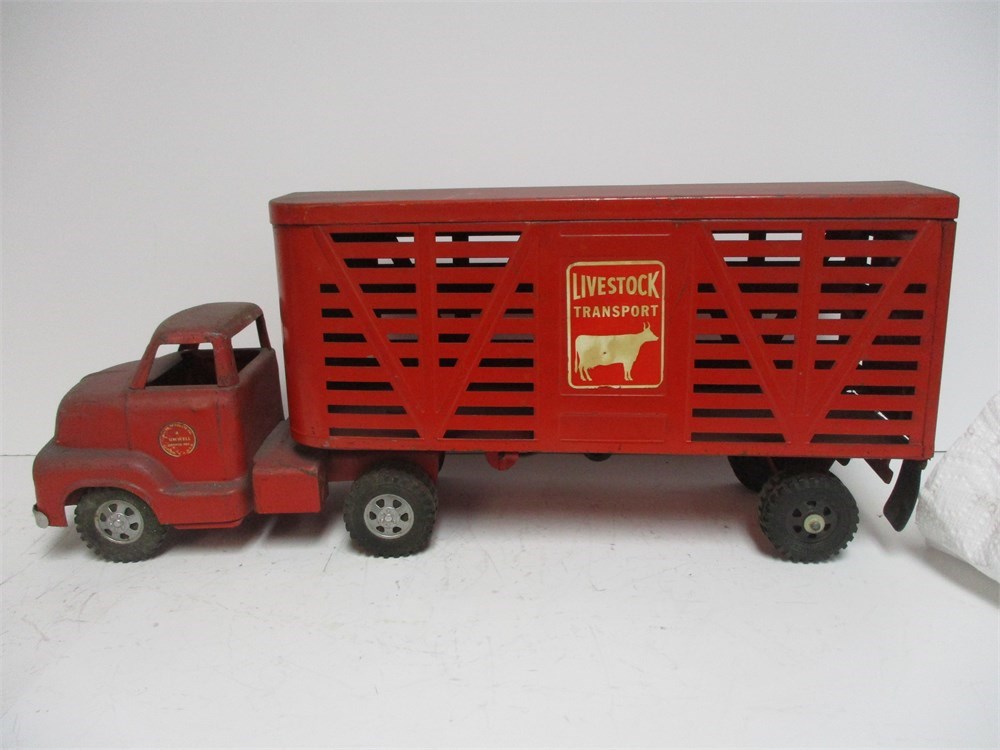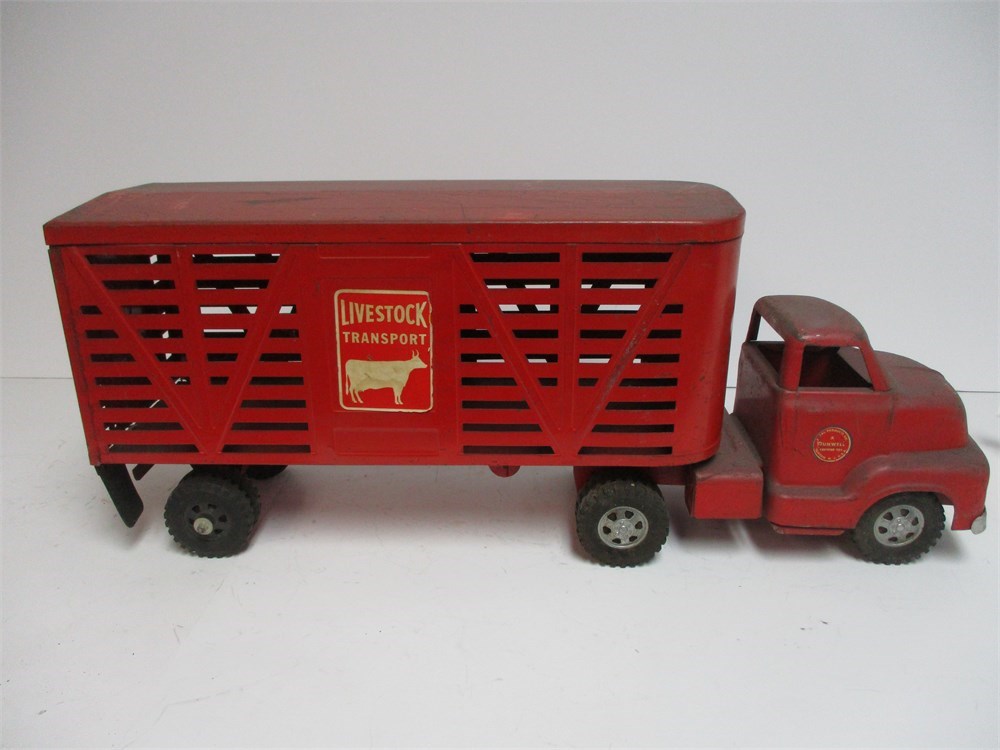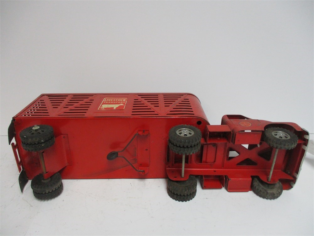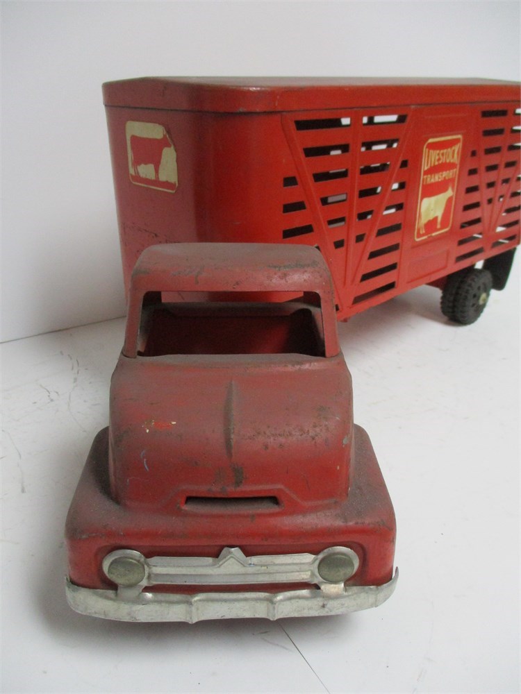 Dunwell “Livestock Transport” Pressed-Steel Semi Truck & Trailer (Red, 1950s–60s