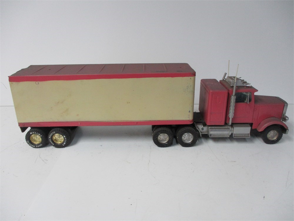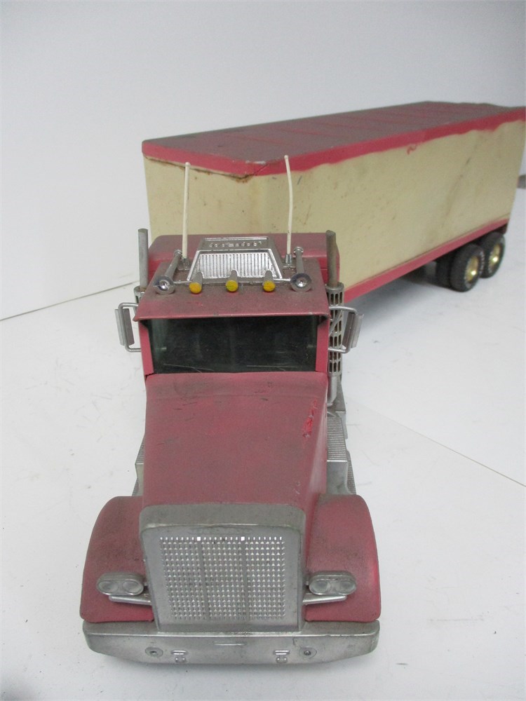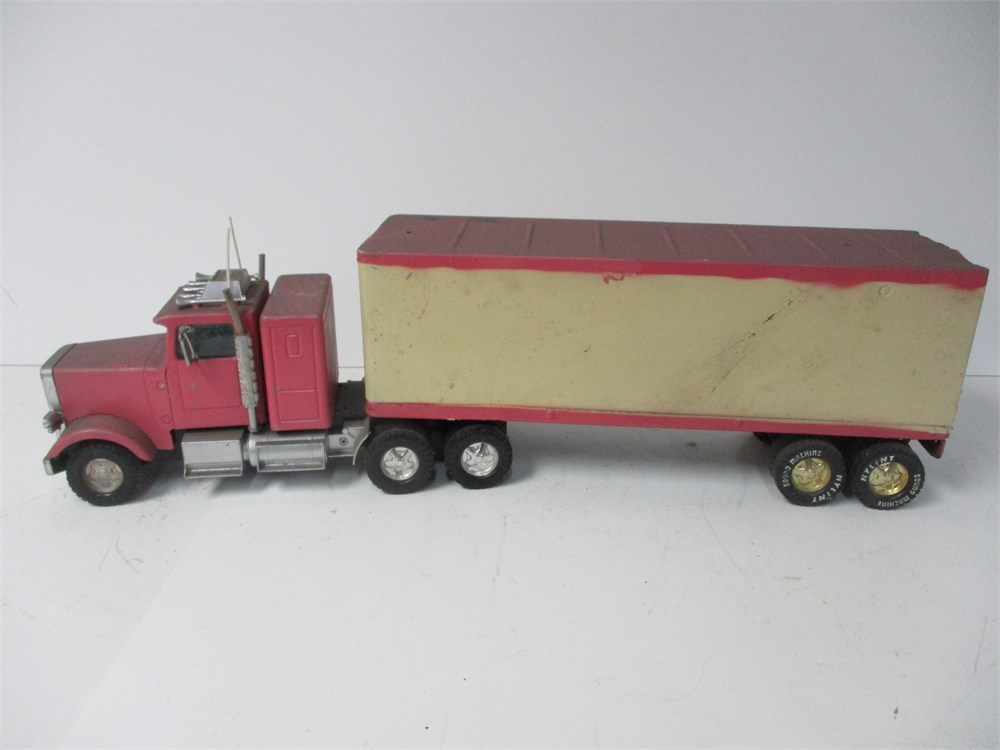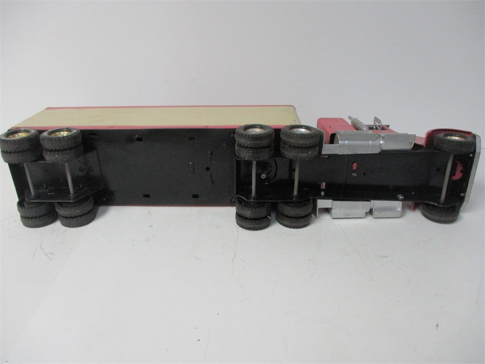 Funrise 2002 Semi Tractor-Trailer Box Van – red cab, beige trailer