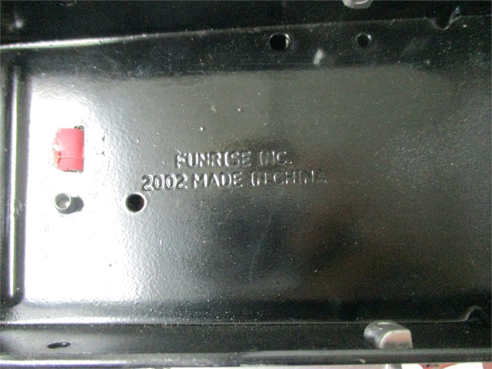 Large Funrise Inc. big-rig (stamped “Funrise Inc. 2002”) with detachable box trailer. Mixed metal/plastic construction, dual antennas, chrome-tone details and rolling rubber-style tires. Shows playwear from use—scuffs, scratches, edge dings and surface dust; trailer and cab finish show marks consistent with age. Hitch and wheels roll freely. See photos for condition.