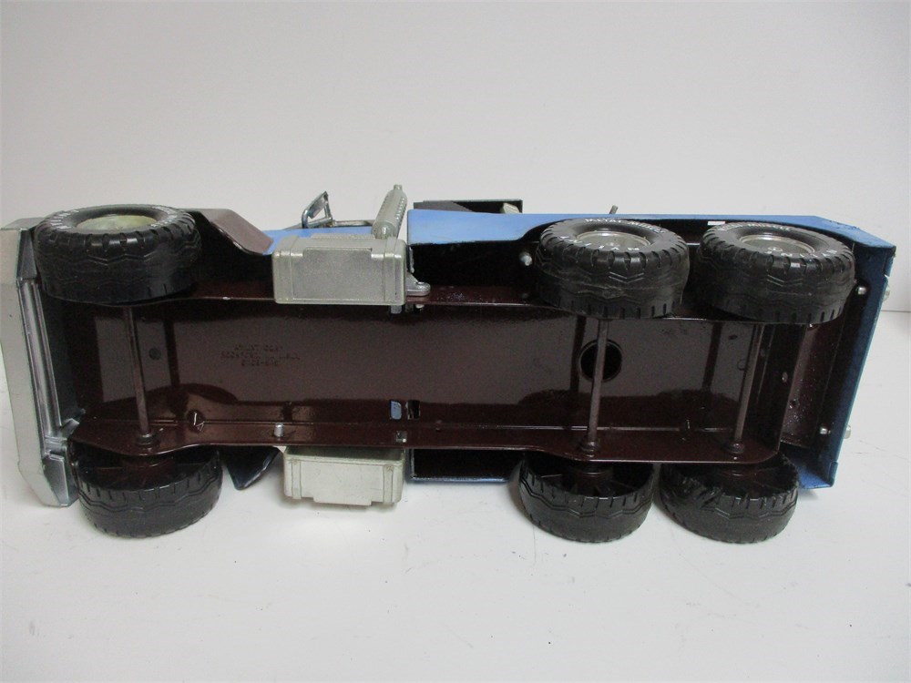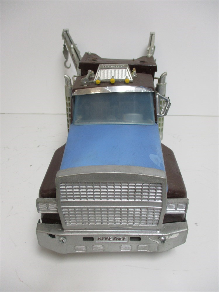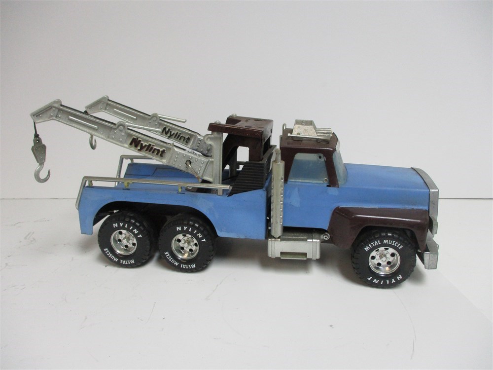 • Vintage Nylint pressed-steel tow truck with dual “Nylint” boom arms and hooks, tri-axle rear, and chrome details.