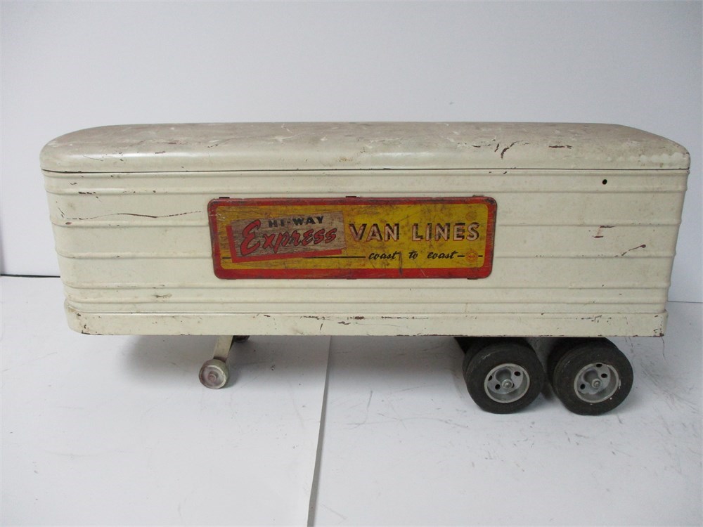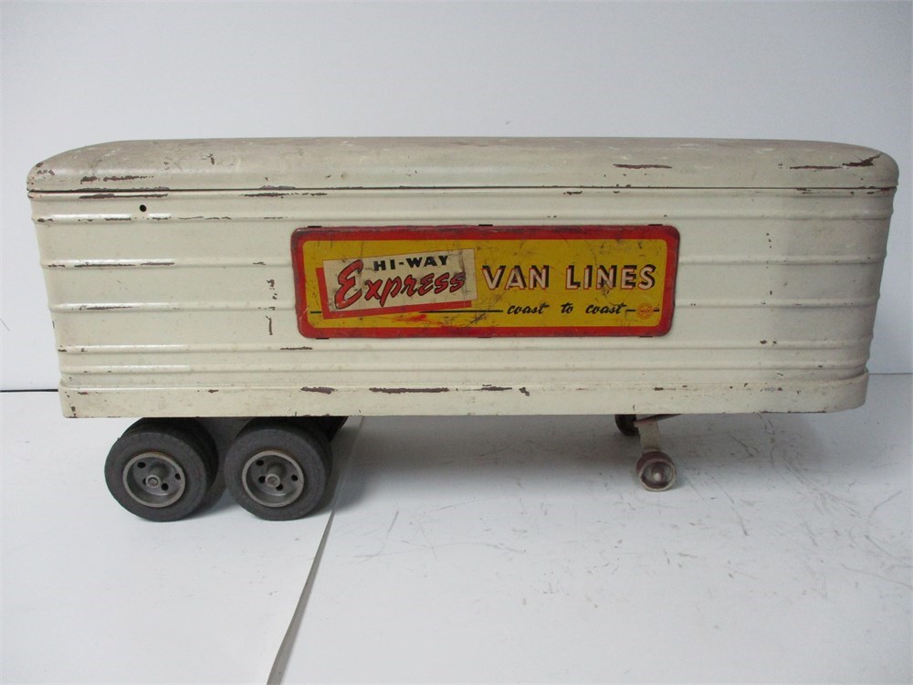 • Classic pressed-steel box/van trailer with rounded nose and original “Hi-Way Express Van Lines – coast to coast” decal.