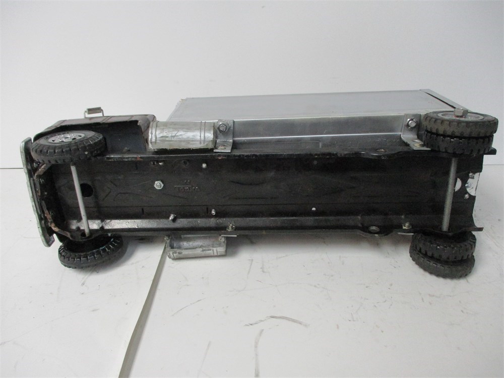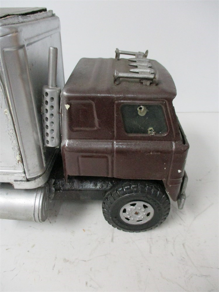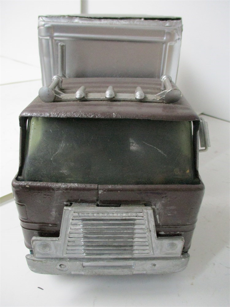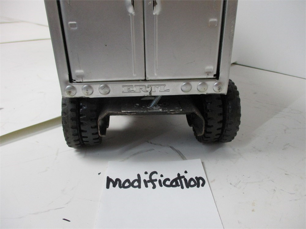 • Condition: Well-played. Custom repaint to cab and box. Noticeable dings, scratches, edge wear and oxidation from play/age. Windshield glazing missing; some trim/marker pieces absent. Box and/or cab show imperfections and small extra holes from prior repairs. Undercarriage shows playwear but rolls freely. See photos for close-ups.