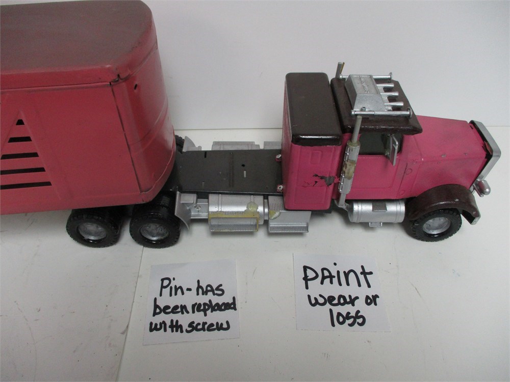 Custom repaint to cab and trailer (pink). General play wear with chips, scratches, and oxidation/rust spotting. Kingpin/hitch pin replaced with a screw (see photos). Some small trim pieces may be missing (e.g., horns/antennas). Rolls as shown.