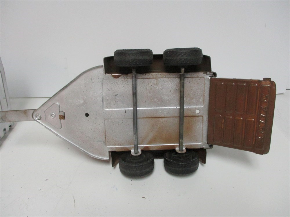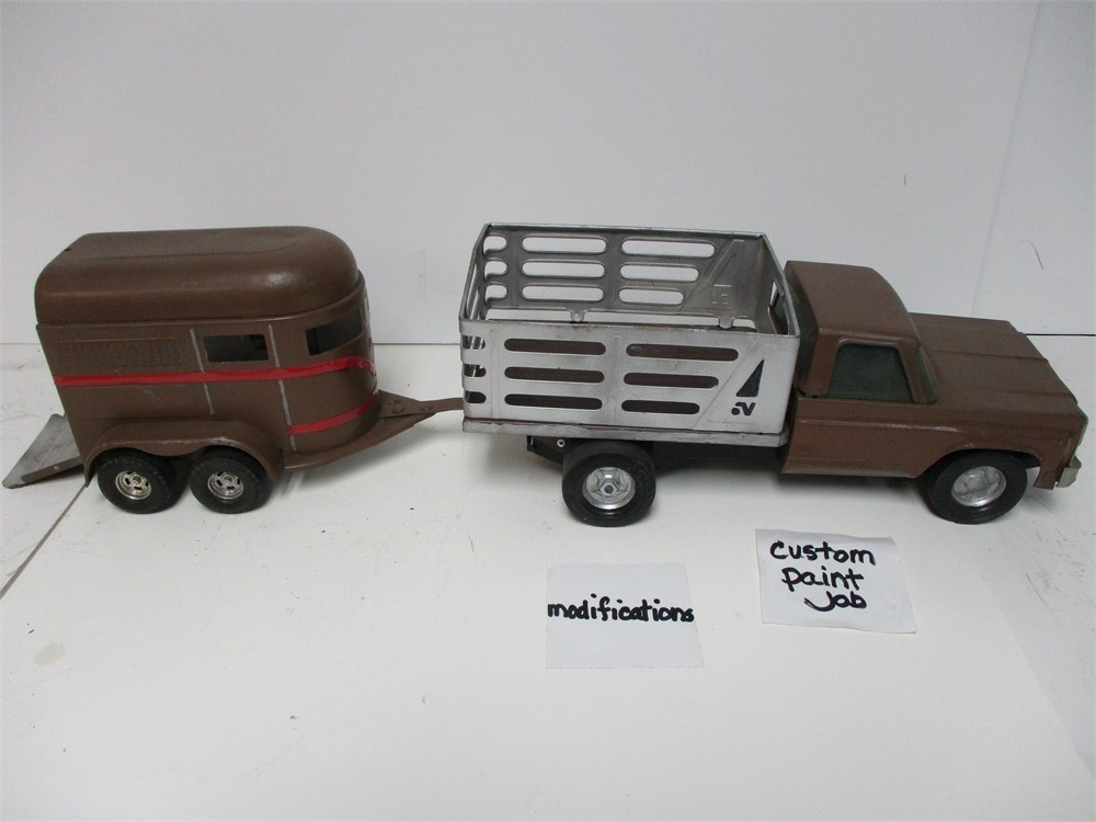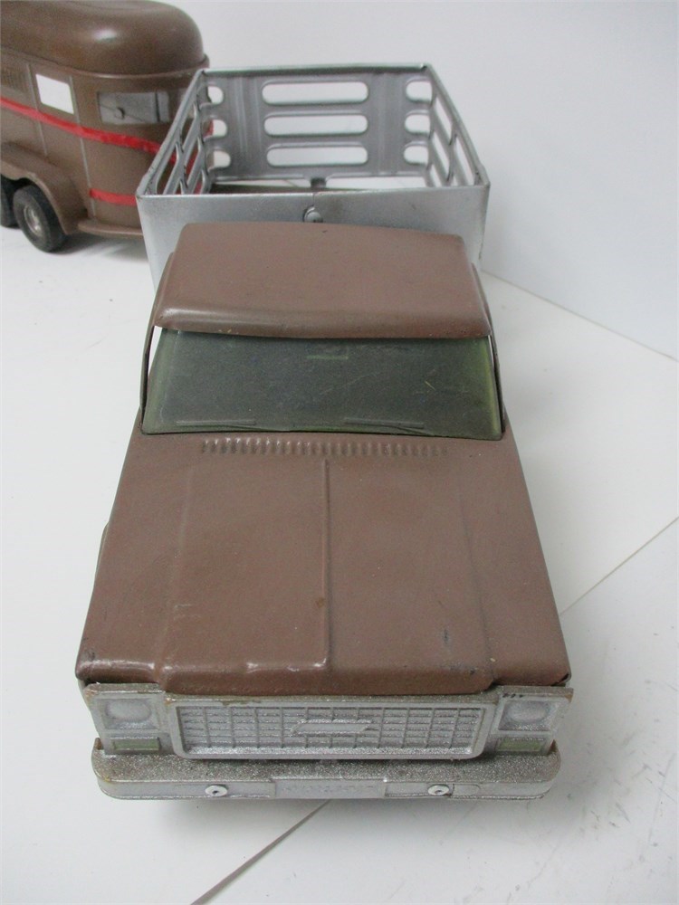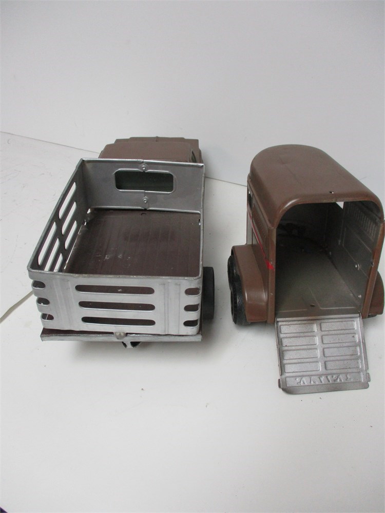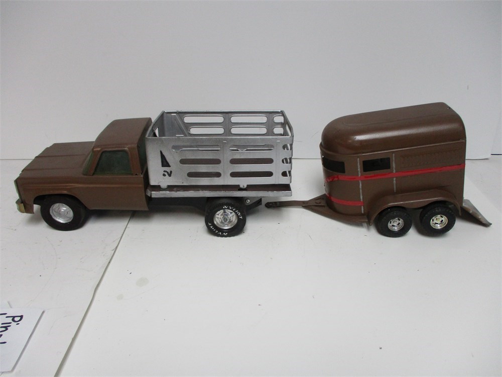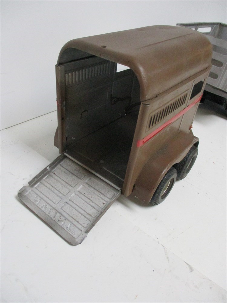 • Vintage pressed-steel pickup fitted with removable livestock rack, paired with a Tonka style two-horse trailer. (Nylint)