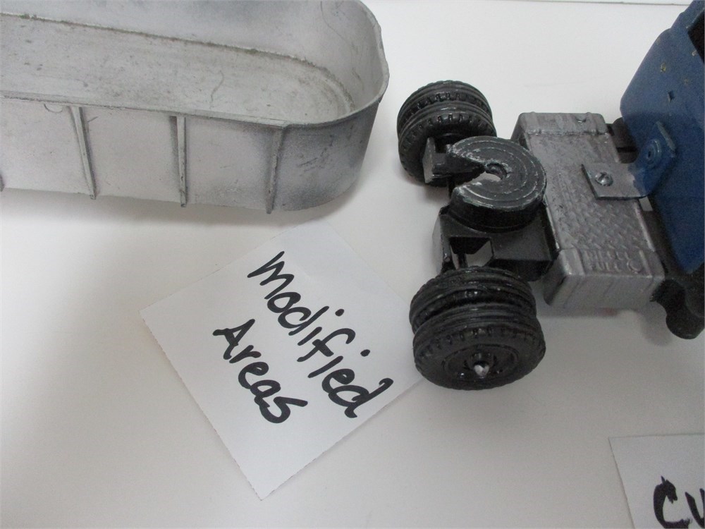 Key notes (condition): custom paint; modified fifth-wheel/kingpin area (see close-ups); general playwear, scratches, and oxidation; light surface rust on hardware/axles; windshield/trim not present; tires roll freely; sold as-found.