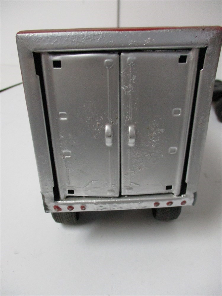 This vintage pressed steel semi truck and trailer set features a bold red cab paired with a matching red box trailer, creating a striking display piece for collectors of classic toy trucks. The truck showcases a chrome-look front grille and bumper, with a simple but rugged cab design reflective of mid-20th century toy manufacturing. The box trailer is finished in red with clean lines and solid construction, complemented by silver rear doors that open to reveal storage space. Rolling wheels allow for easy movement, and the set maintains good structural integrity despite visible play wear. Areas of paint wear, scuffs, and minor surface oxidation can be noted, especially on the edges and corners, consistent with age and handling. This piece captures the charm of vintage pressed steel vehicles and would make an excellent addition to any display of antique toys, transportation memorabilia, or mid-century collectibles.