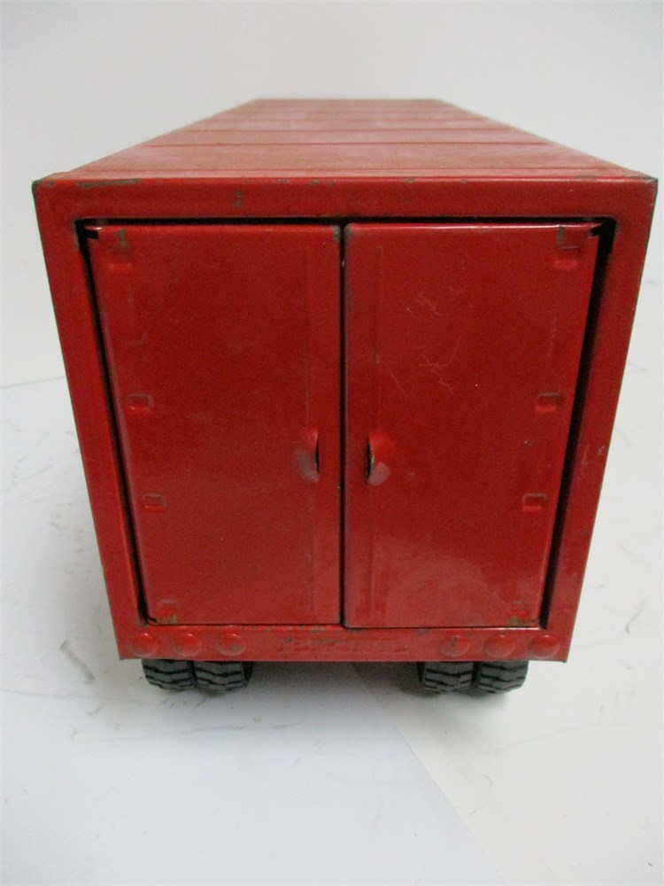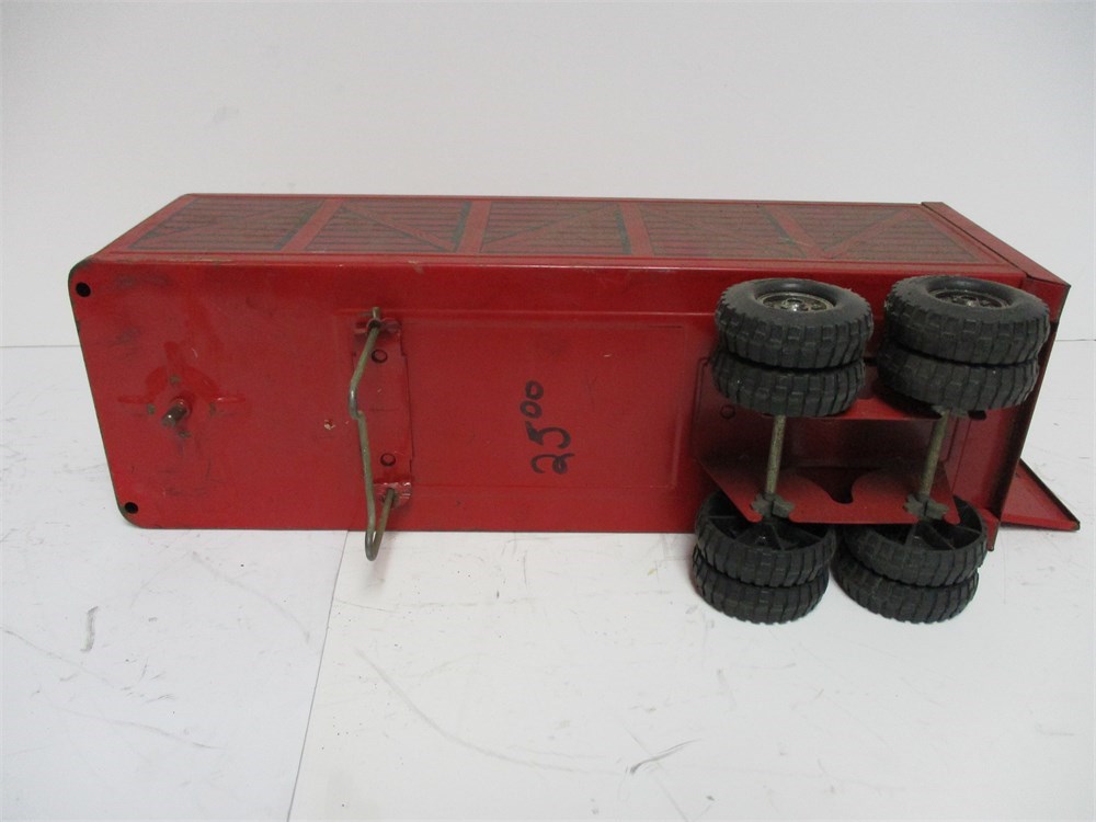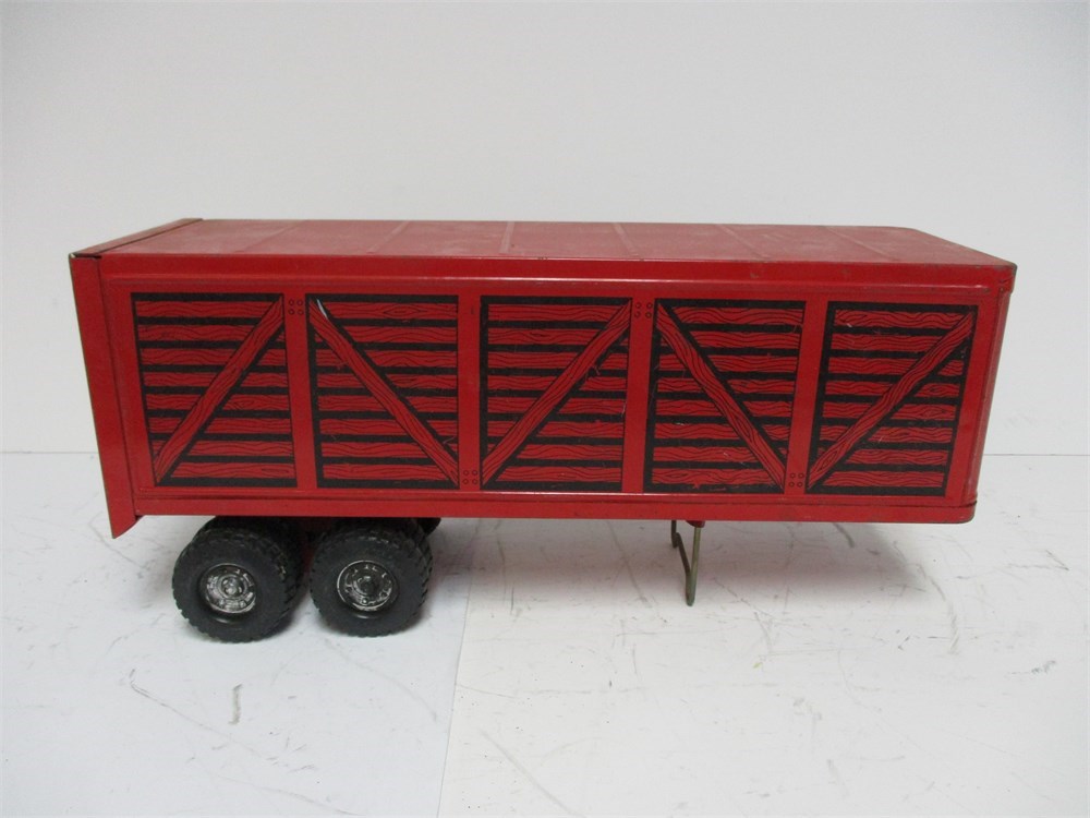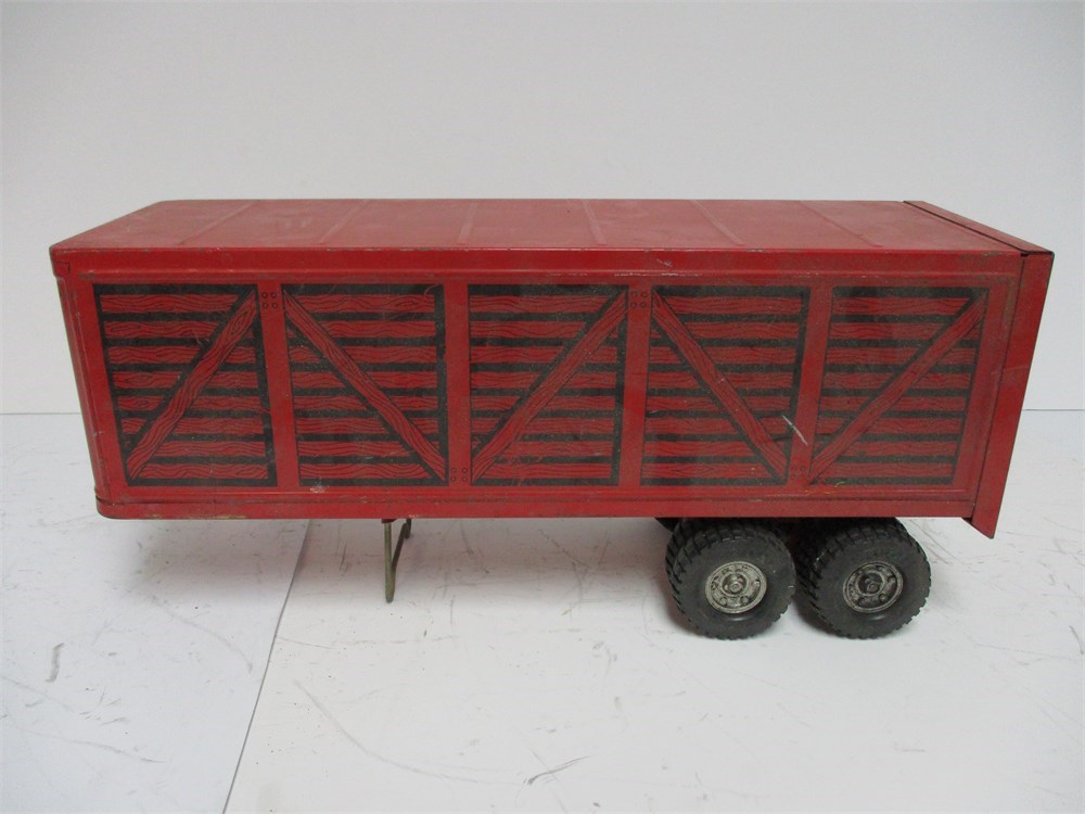 Mid-20th century toy livestock/van trailer in red with black tin-litho slat-and-brace side graphics; dual rear axles with knobby rubber tires and metal hubs; fold-down landing gear/jack at the front. Unmarked maker (typical of Marx/Wyandotte/Structo era). Sold without tractor.