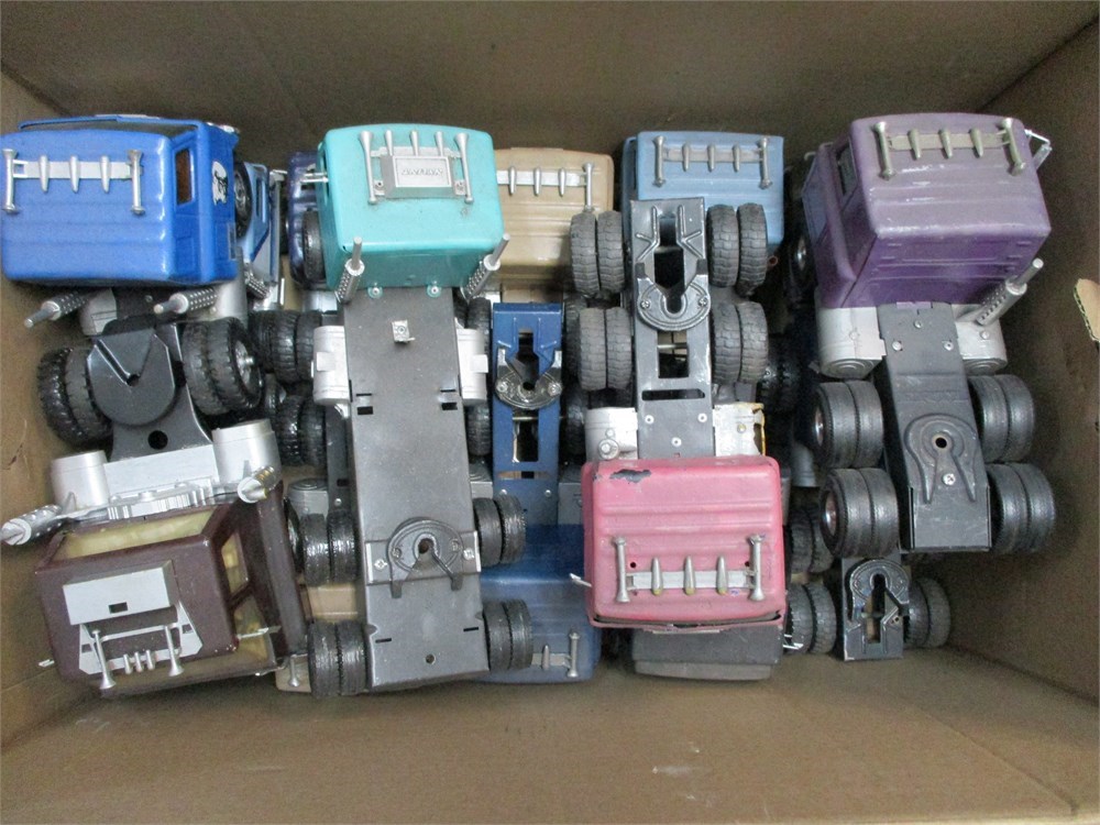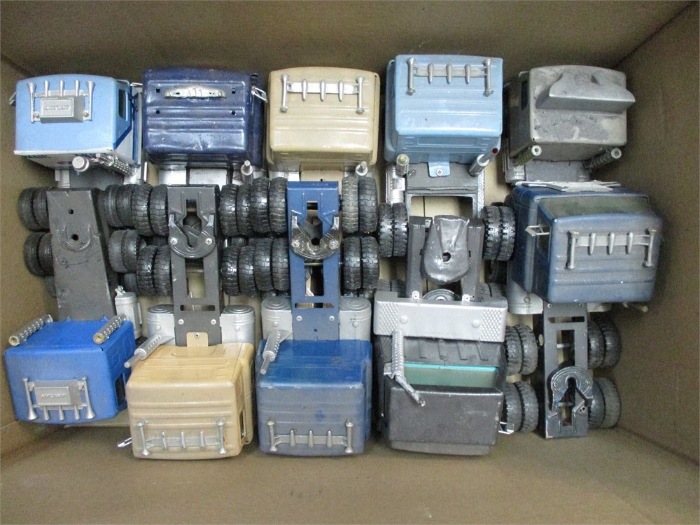 Large box lot containing pressed-steel semi-tractor cabs, mid-to-late 20th century. Painted in assorted colors (blue, tan, gray, white), each with dual rear axles, rubber “Super Hi-Traction” tires, and chrome plastic accessories including exhaust stacks, ladders, and grilles. Some retain fifth wheels for trailer attachment. Likely makers include Tonka, Structo, or similar, though most appear unmarked.
