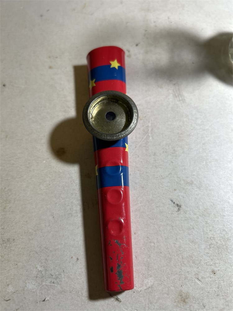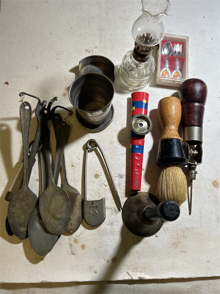Vintage School Bell Brass And Wood Handle 4 Inches Antique Greek Key Mini Oil Lamp Key Pattern Square Tank, Clear Vintage Wood Handled Scratch Awl Or Tool Ice Pick Metal 7" Vintage Metal Kazoo- Red/Black and more