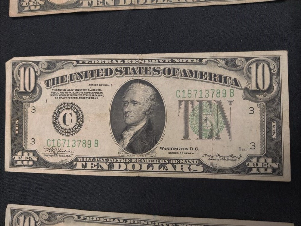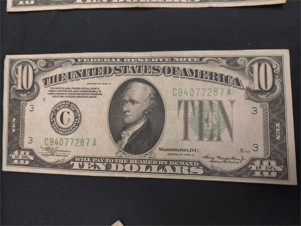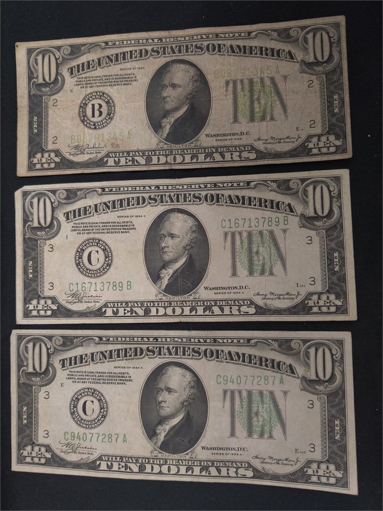 Lot of three 1934 green seal $10 bills. Two of them are 1934A and the other is just 1934. I'll look to be in find a very good condition.