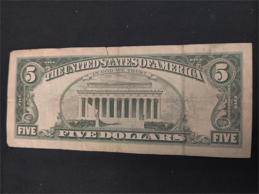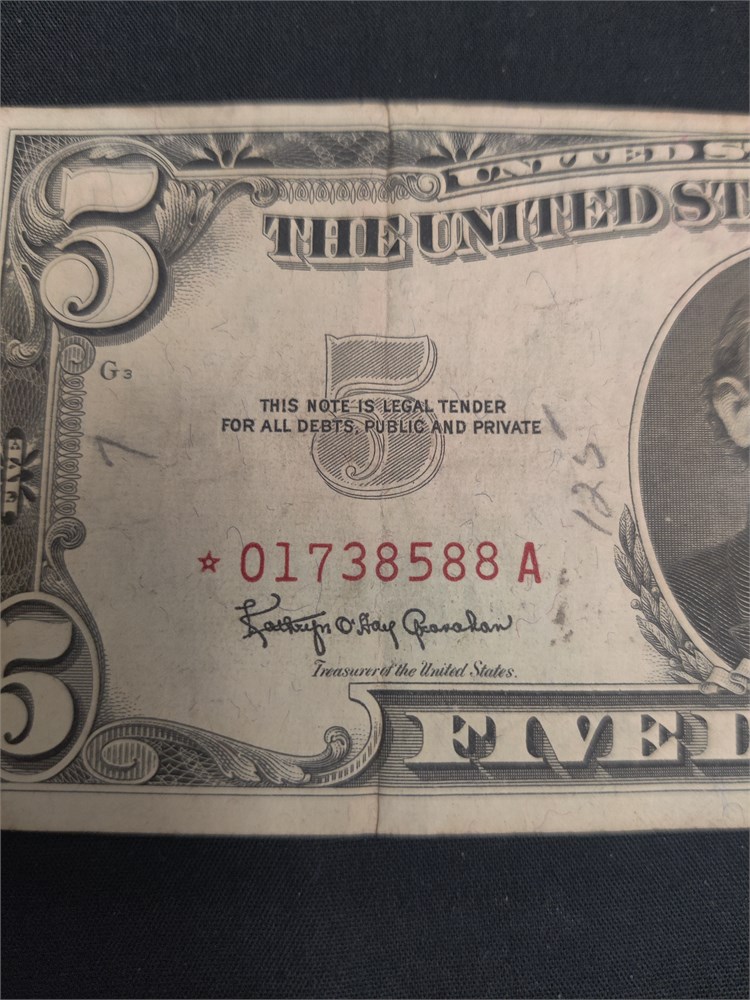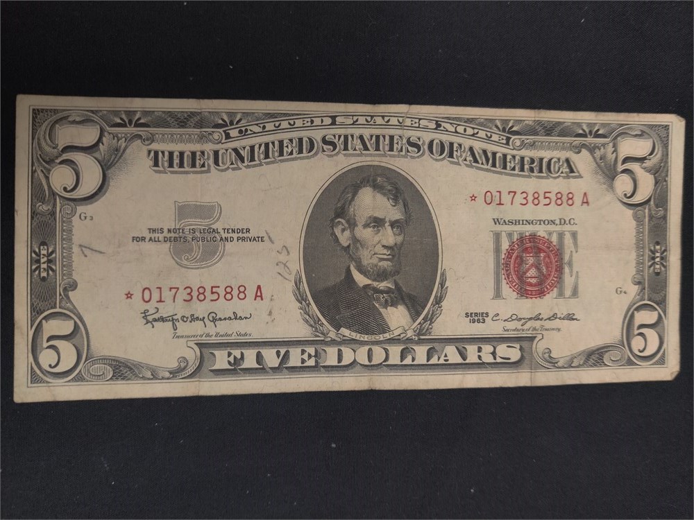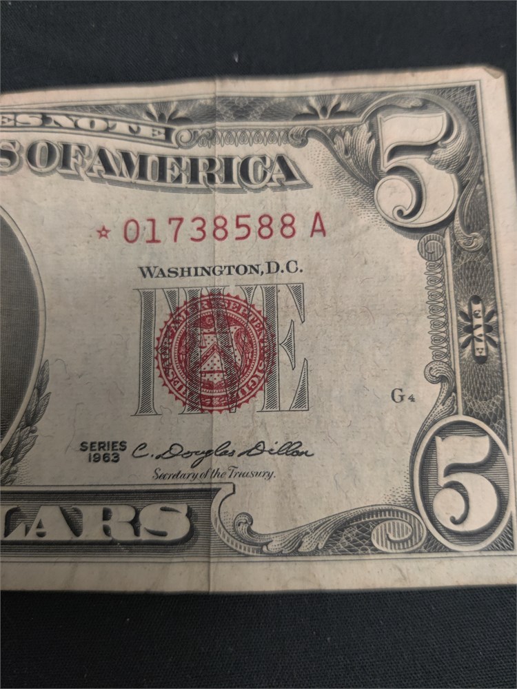1963 red seal Star Note $5 bill. Note is in good condition.