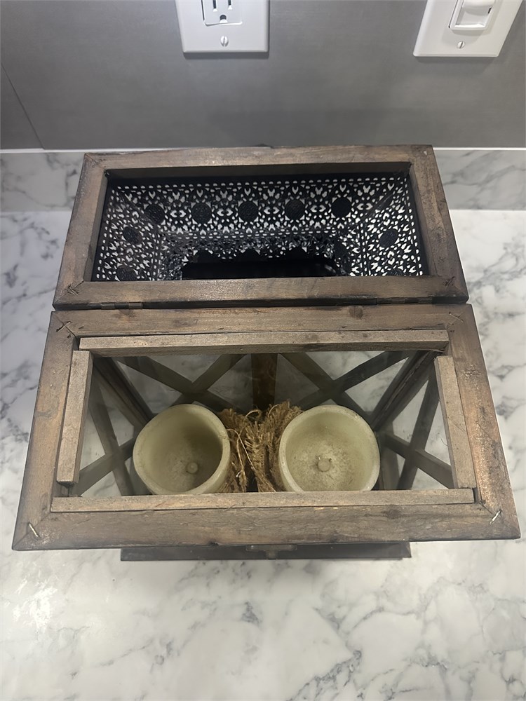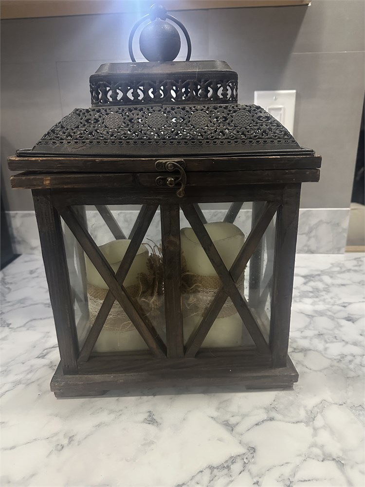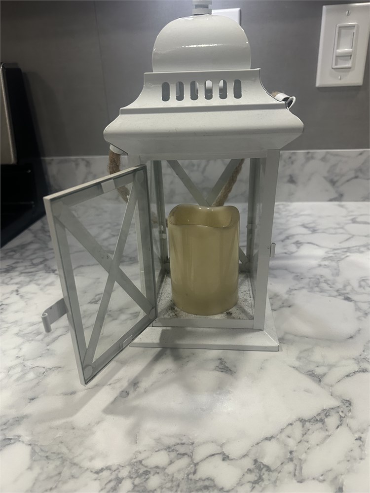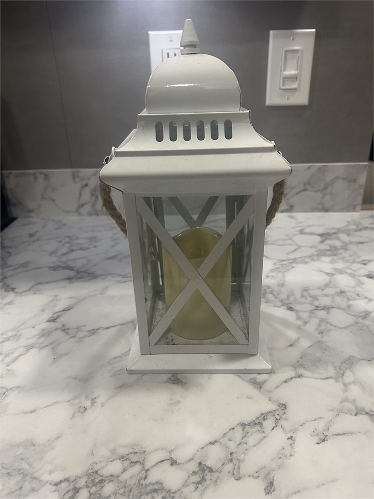 2 vintage lanterns White one needs batteries for the light to work or take out the candle and insert a real candle.