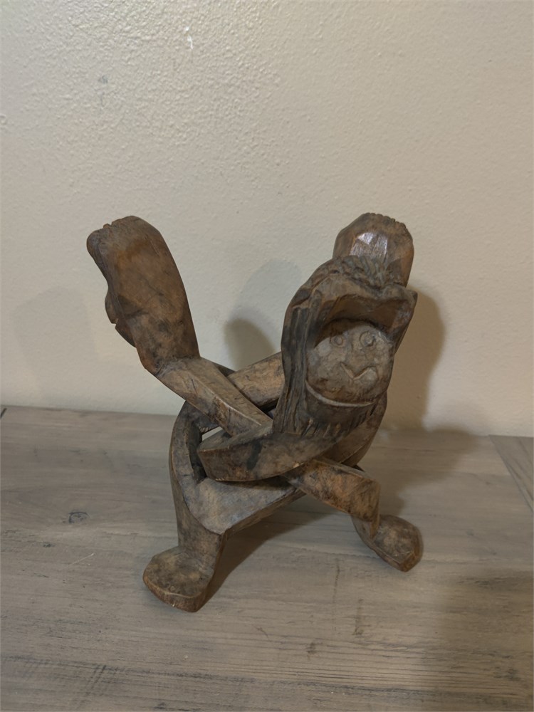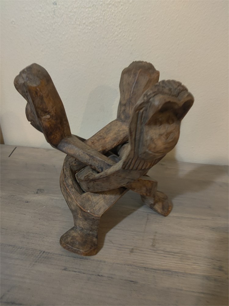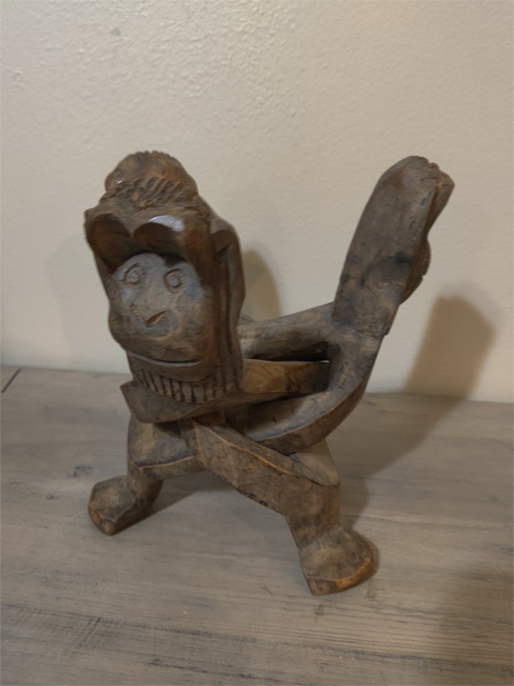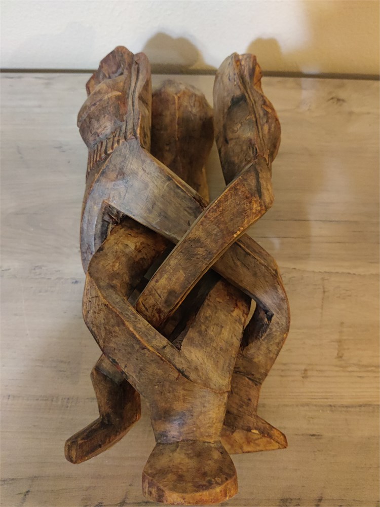 African Carved Wood 3 Monkey Head Unity Interlocking Sculpture. Win folded out sculpture stands about 9 in tall.