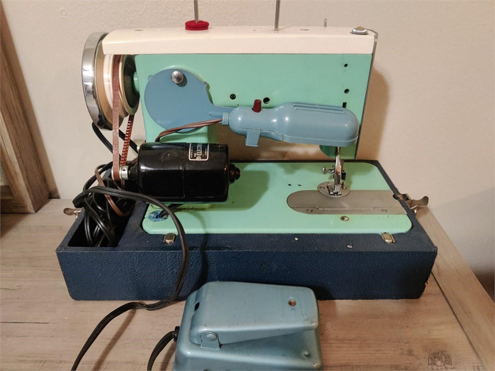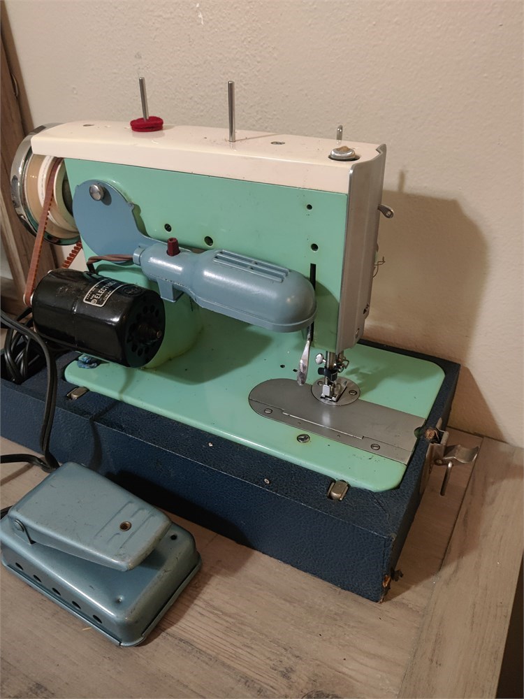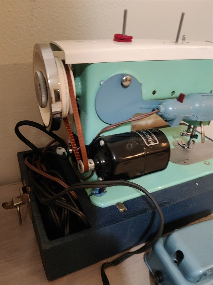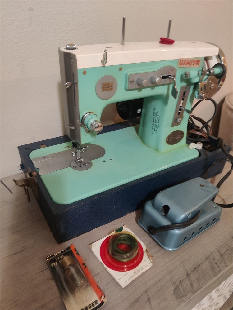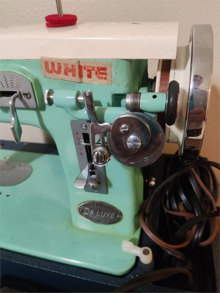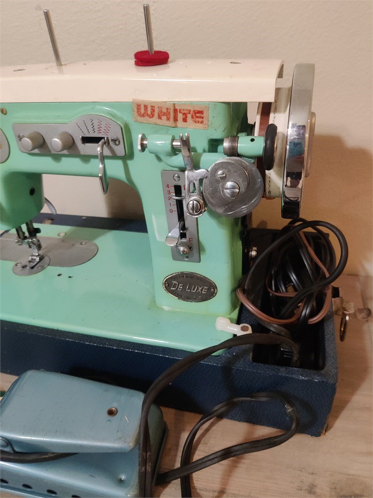 Vintage White deluxe sewing machine. Model JA47-132. Machine was made in Japan. Comes in carry case and also includes additional light bulbs and motor belt.
