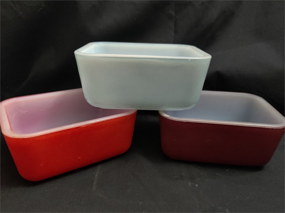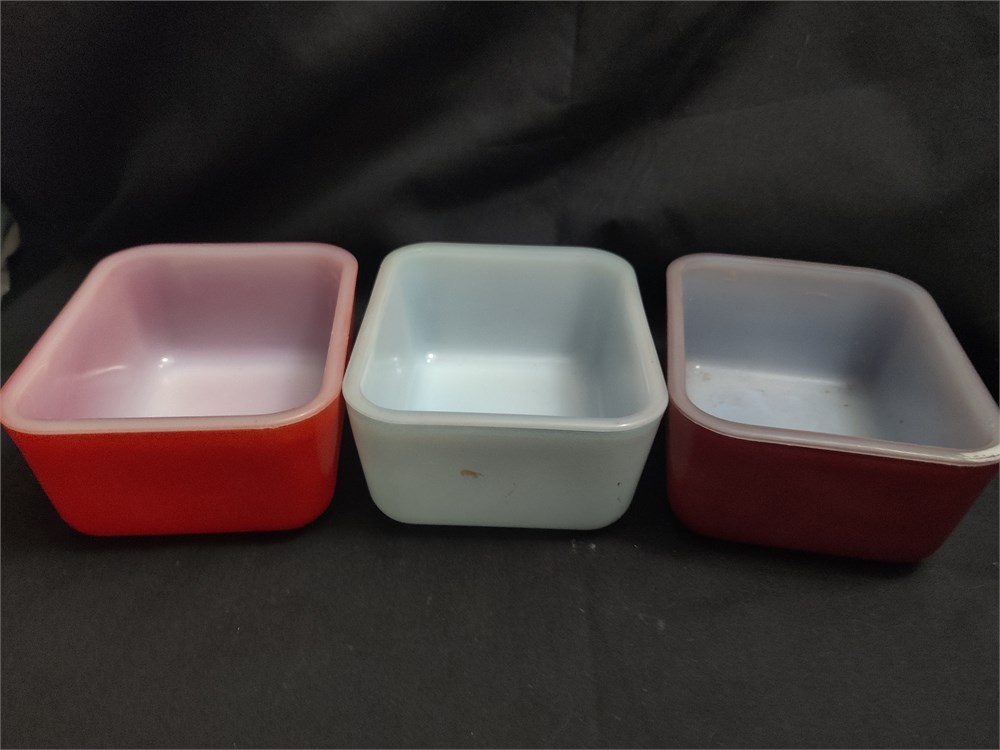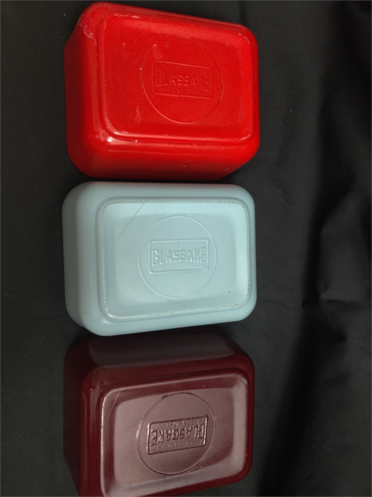 3 Glasbake Colored Dishes. Each measures 5"x4". No lids included.