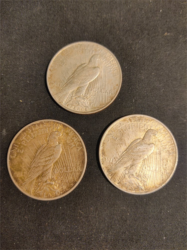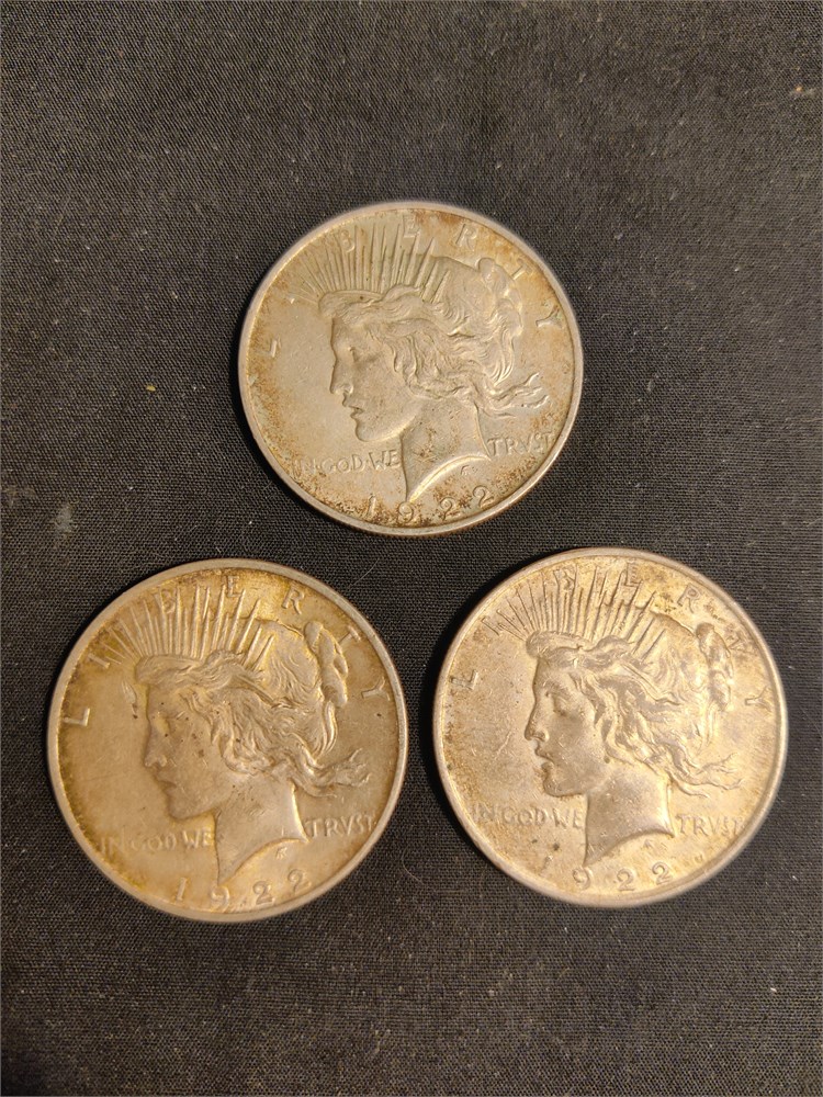 Lot of three 1922 silver peace dollars. Please see pictures for condition of coins.