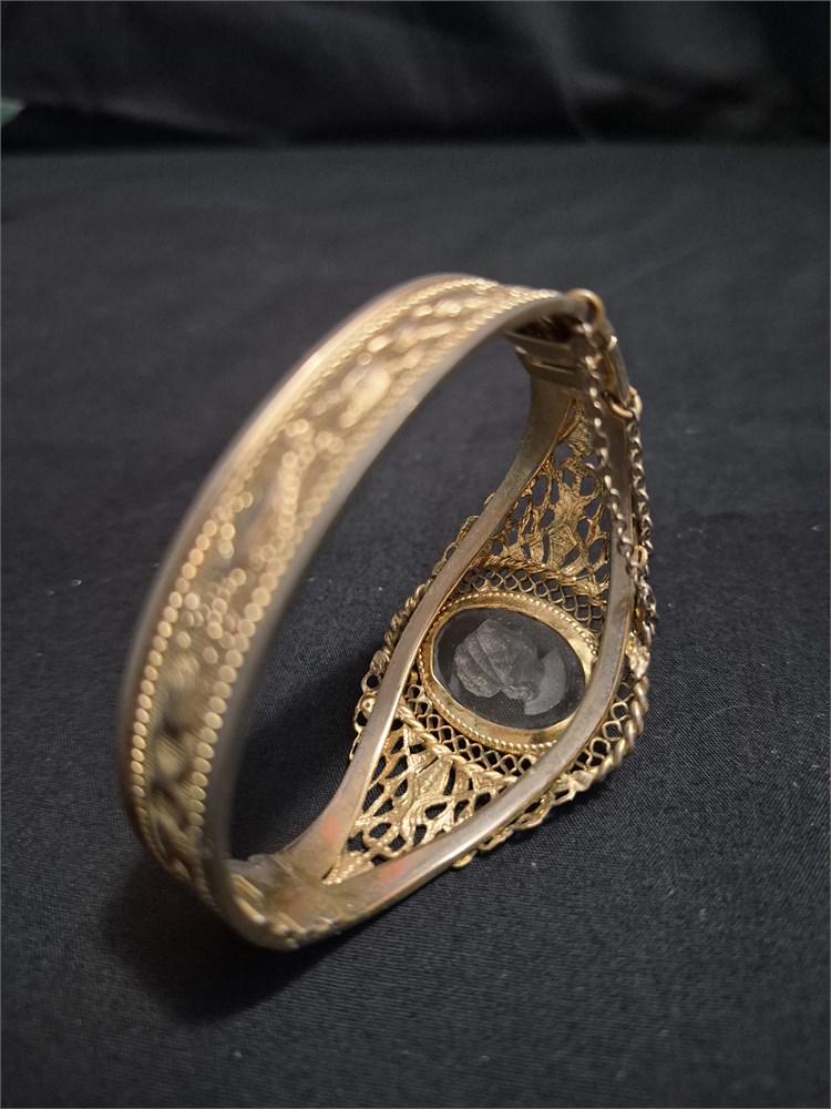 Vintage Whiting and Davis Co Gold Tone Hinged Chain Glass Cameo Bracelet.
