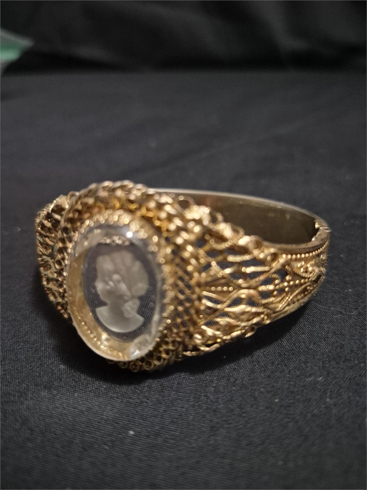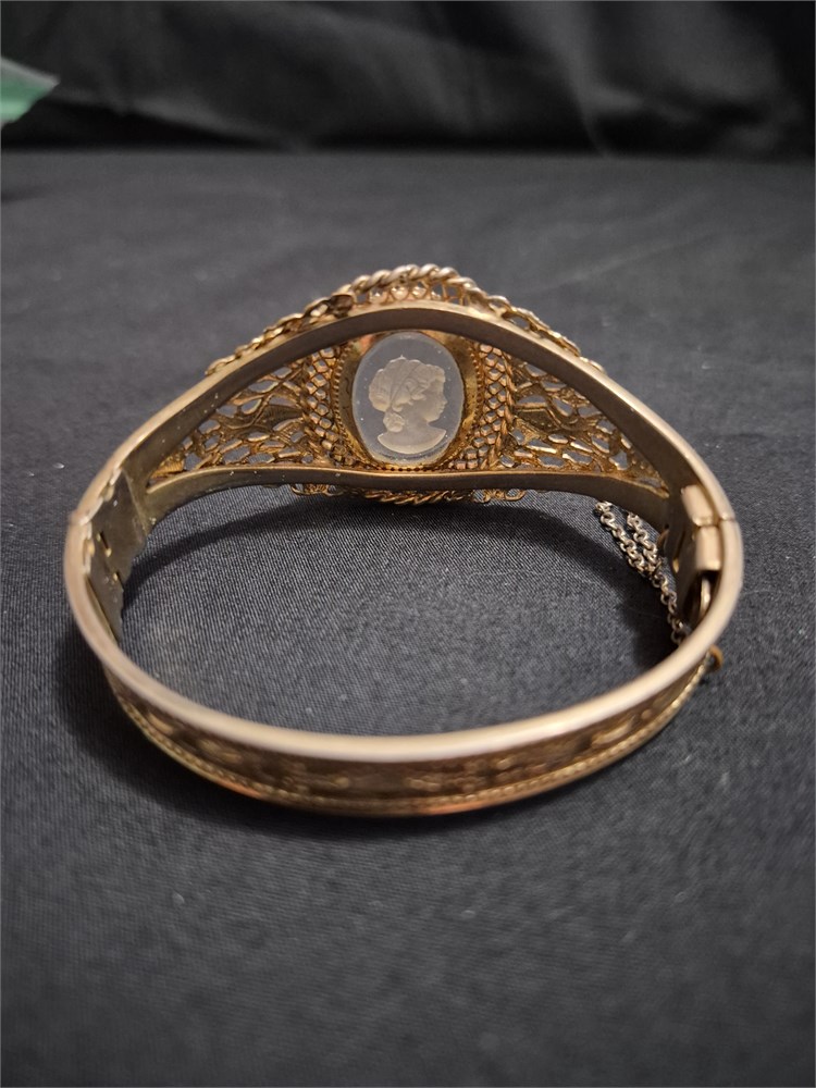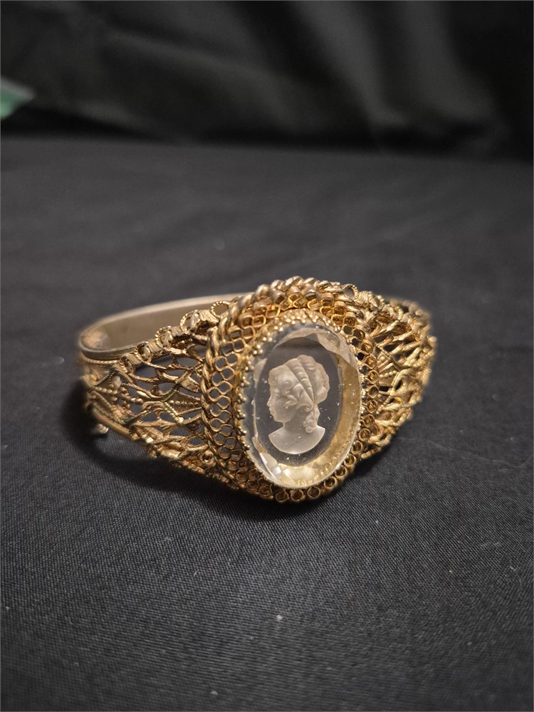 Vintage Whiting and Davis Co Gold Tone Hinged Chain Glass Cameo Bracelet (R)