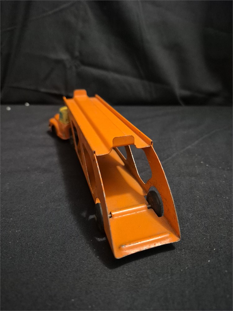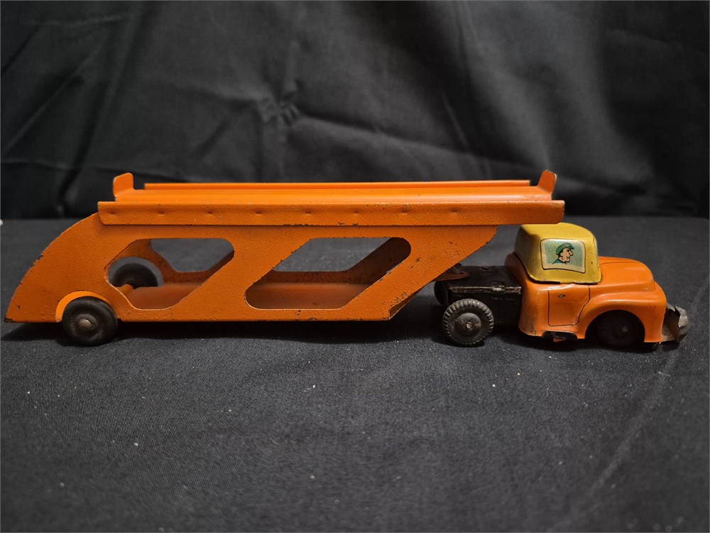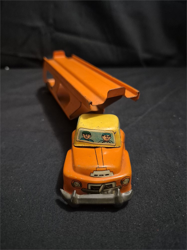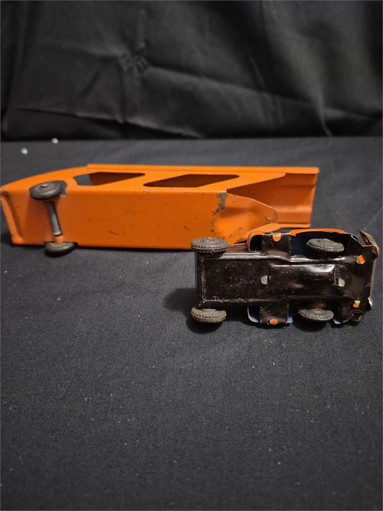 Vintage Lumar Marx 1/64 Tin Semi with Hauler. Truck has friction motor that works a little. Vehicle is in good condition.