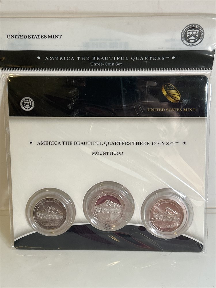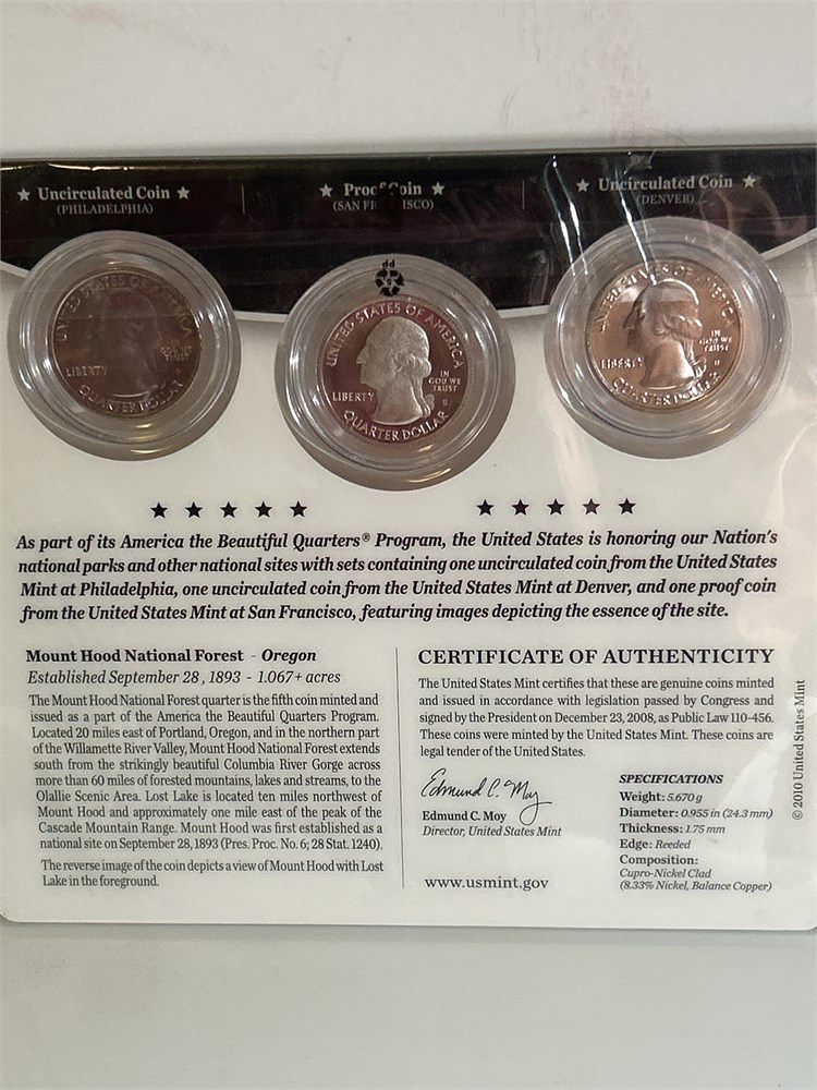 America, the beautiful quarter three coin set Mount Hood uncirculated Denver, San Francisco Philadelphia 2010