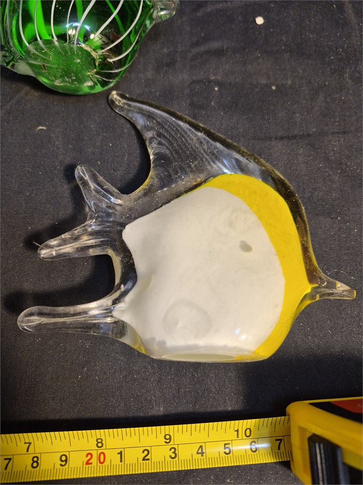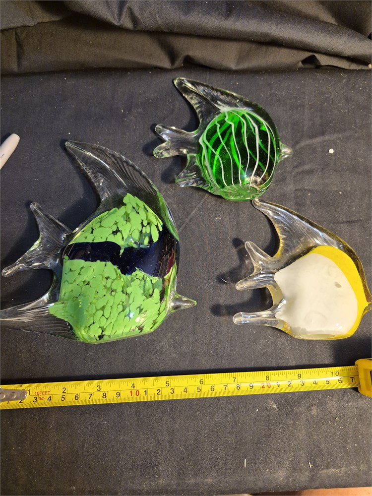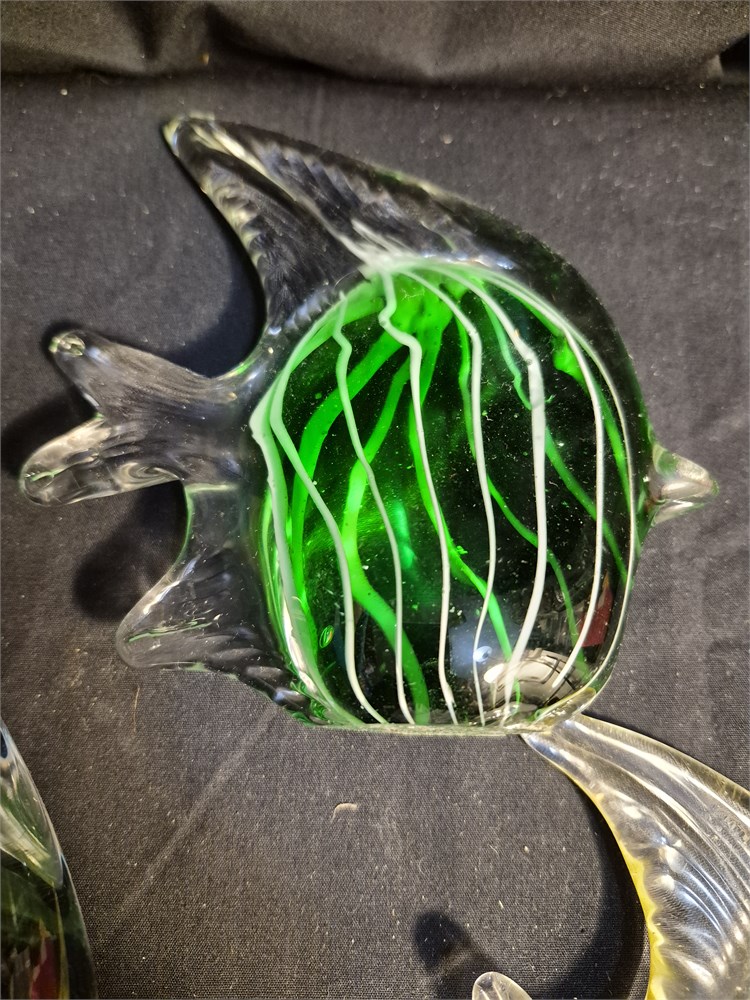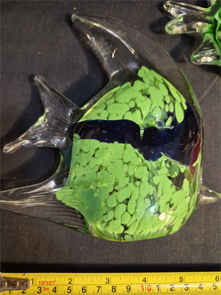 Nice lot of 3 Glass Fish. Large green Fish measures 6" long 7" tall. All three are in good condition.