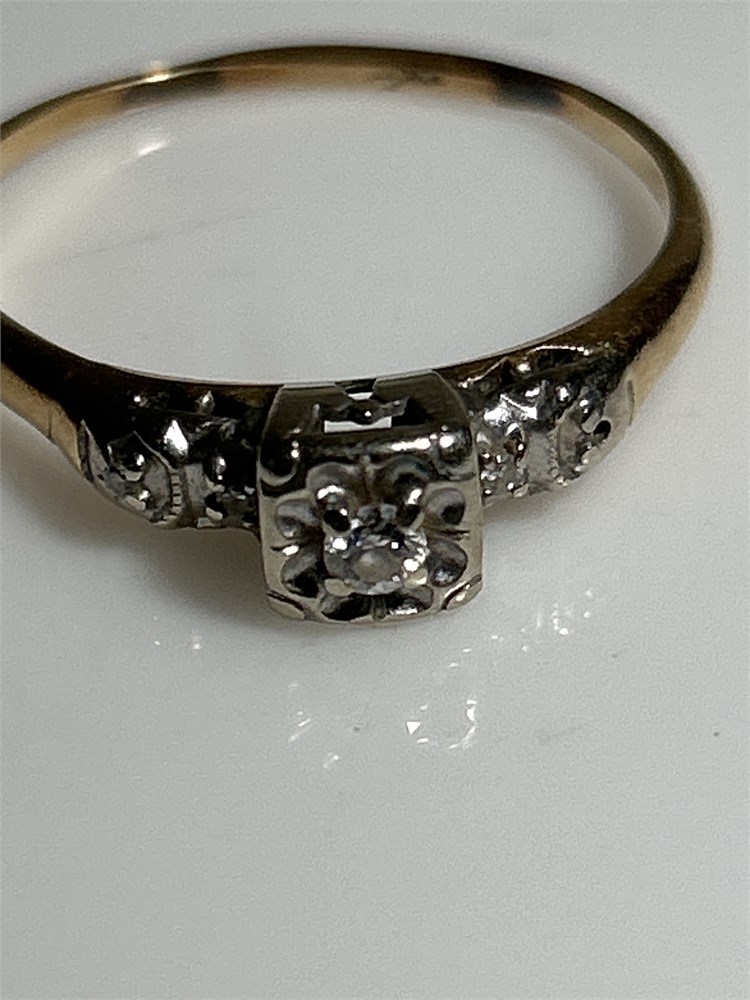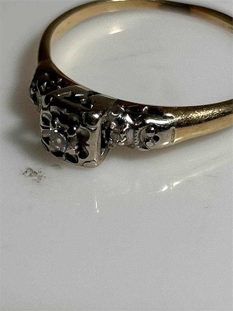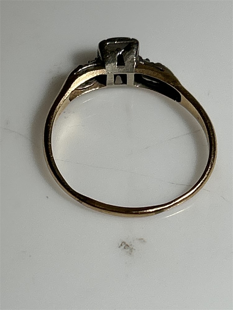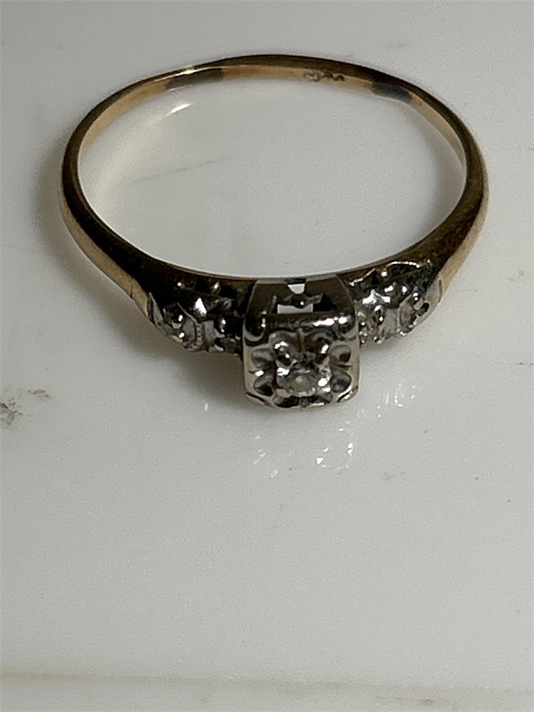 10 karat gold ring one diamond in middle two on sides 2.46 g ring  size 10