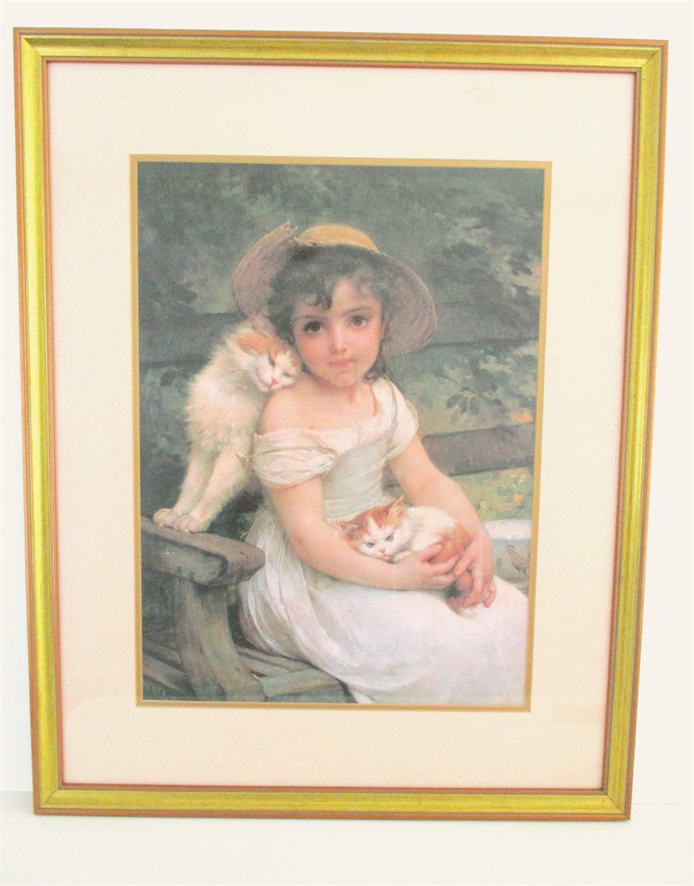 Charming framed reproduction of a 19th-century Victorian-style painting depicting a young girl seated with two affectionate kittens—one resting on her shoulder, the other nestled in her lap. The subject matter and style reflect the sentimental realism of late 19th-century European art, often associated with painters such as Henriette Ronner-Knip or Émile Munier, who were known for children and animal portraits.