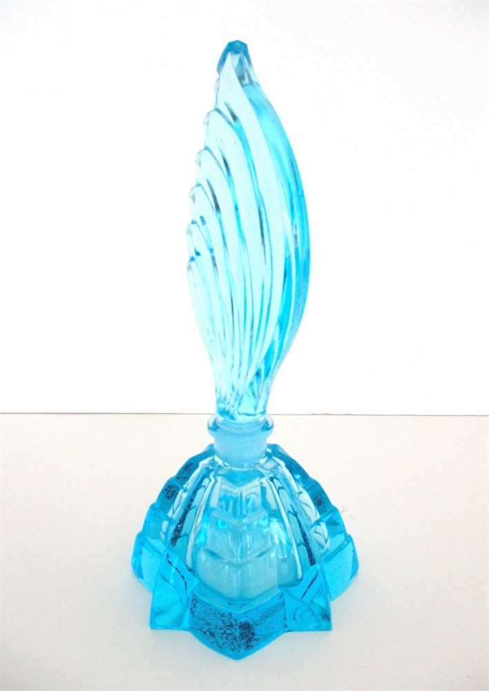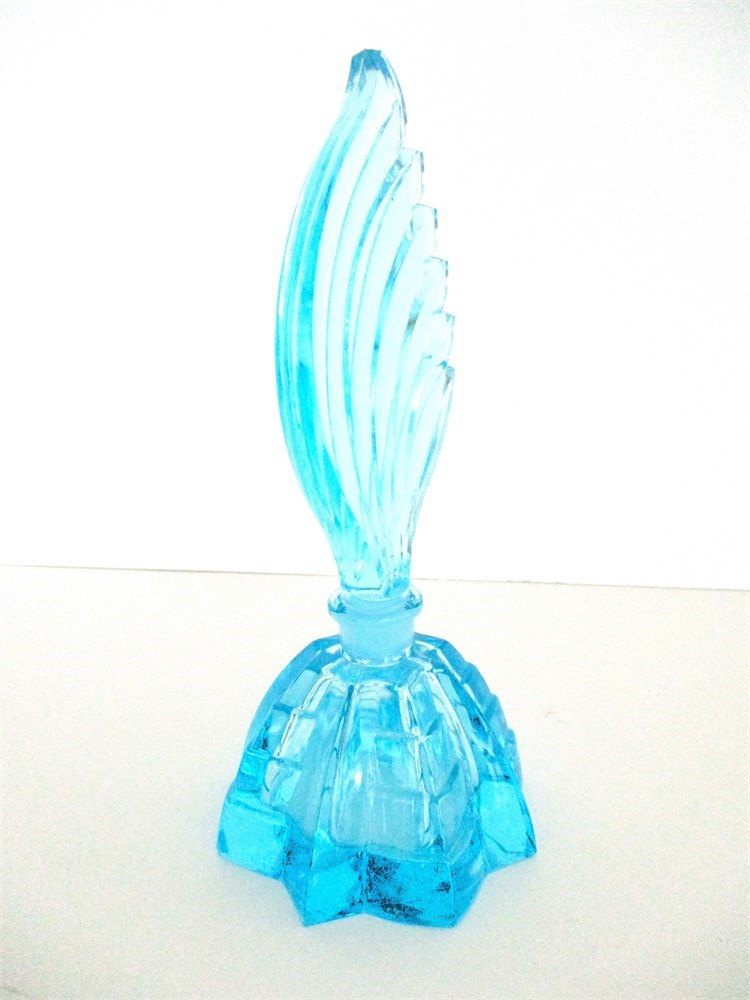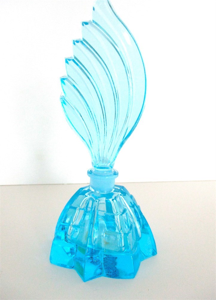 Striking vintage-style perfume bottle in vibrant aqua blue glass, featuring a bold geometric base with stepped facets and a tall fin-shaped stopper in sweeping Art Deco form. Likely produced mid-20th century in pressed glass, this piece exemplifies the dramatic lines and sculptural beauty associated with Deco vanity accessories.