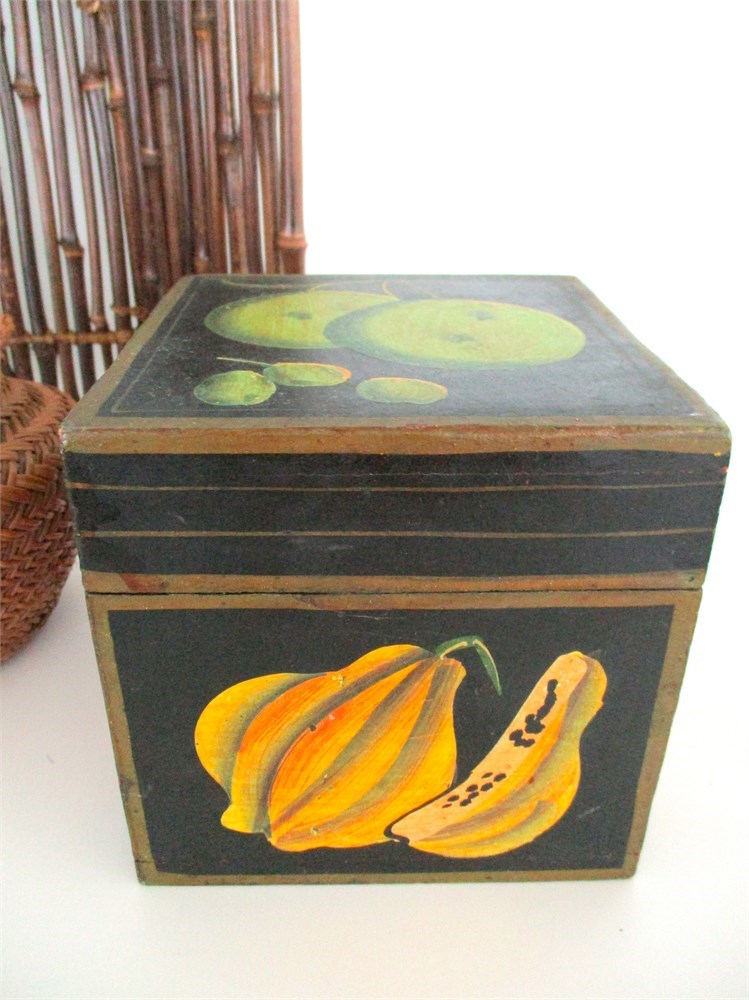 • Painted Wooden Box: Square hinged-lid box hand-painted with fruit motifs on all sides. Decorative, Approx. 6 x 6 in.