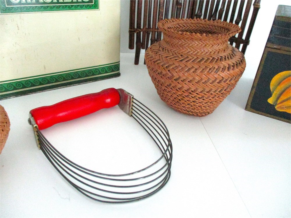• Kitchen Utensil: Wire pastry blender with red-painted wooden handle, circa 1940s–1950s.