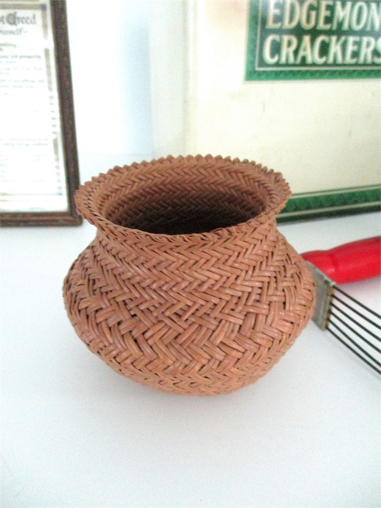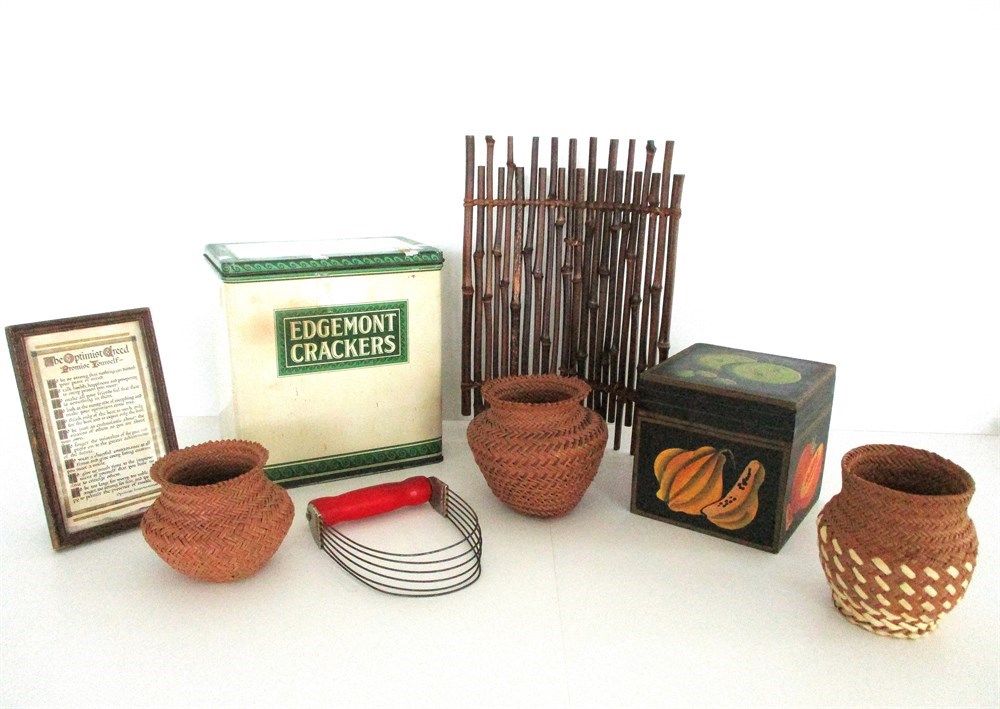 • Three Handwoven Baskets: Small round woven reed baskets, each with unique patterning. Likely mid-century folk art or decorative craft. Tallest approx. 5 in.
