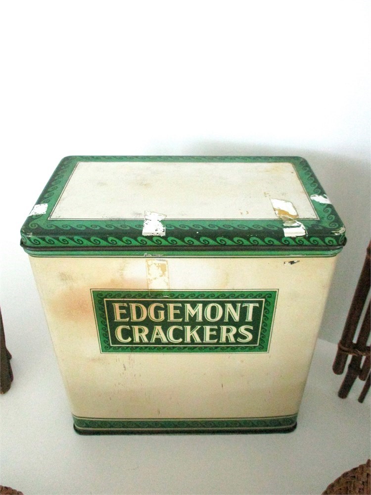 • Advertising Tin: Rectangular “Edgemont Crackers” tin, white with green trim and lettering, early to mid-20th century. Light surface wear consistent with age. Approx. 8 x 7 x 4.5 in.